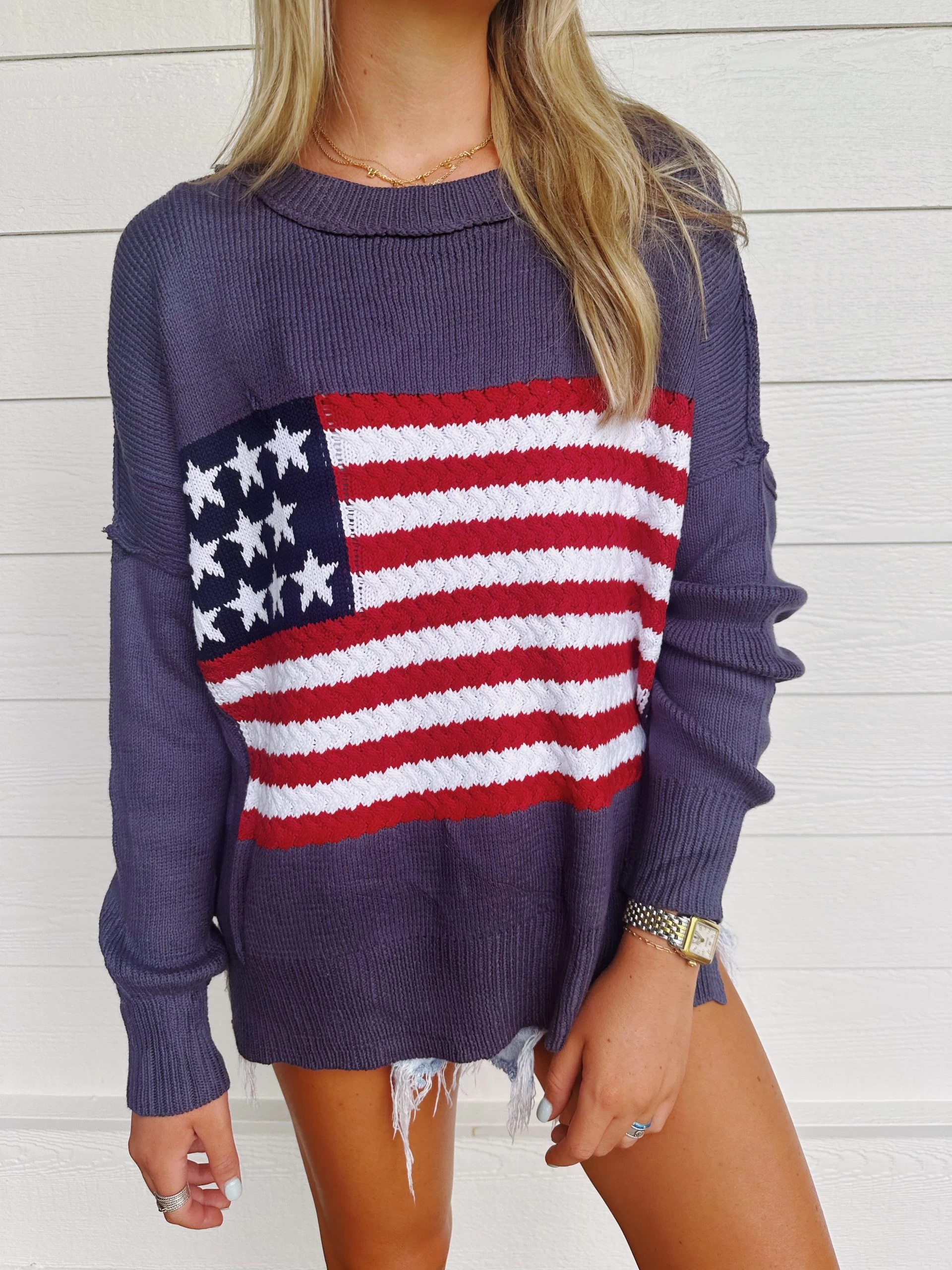 Be patriotic and cozy in our American Flag knit lightweight sweater. Perfect for those cool nights or a swimmy coverup!ย