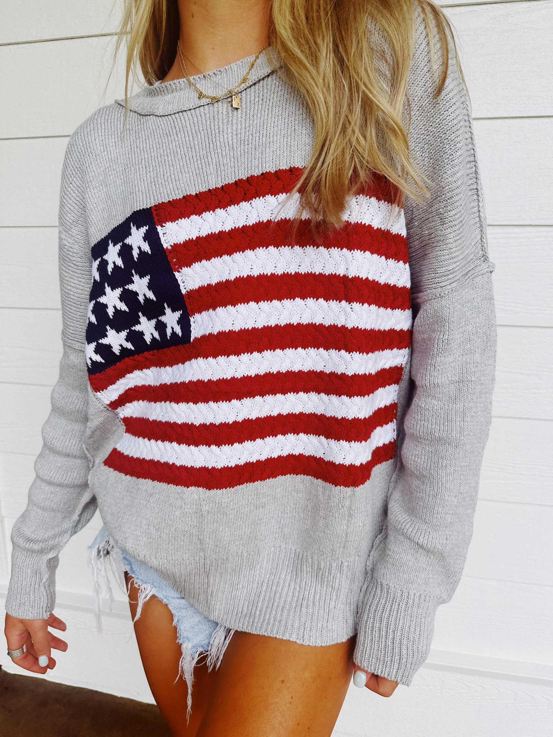 Be patriotic and cozy in our American Flag knit lightweight sweater. Perfect for those cool nights or a swimmy coverup!ย