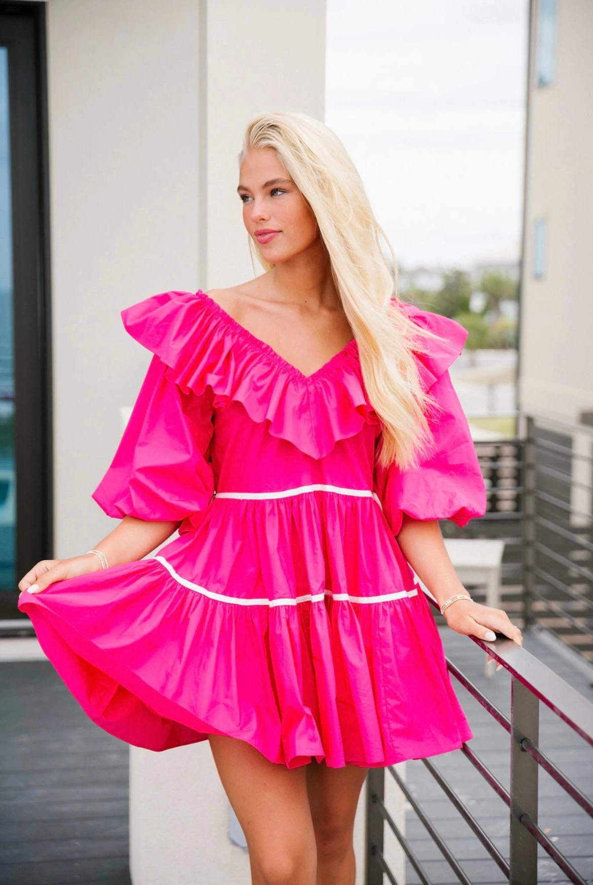 A round of applause for our babydoll Callie Plunge mini dress! This dress features a puff sleeve with a plunge neckline with ruffle detailing.