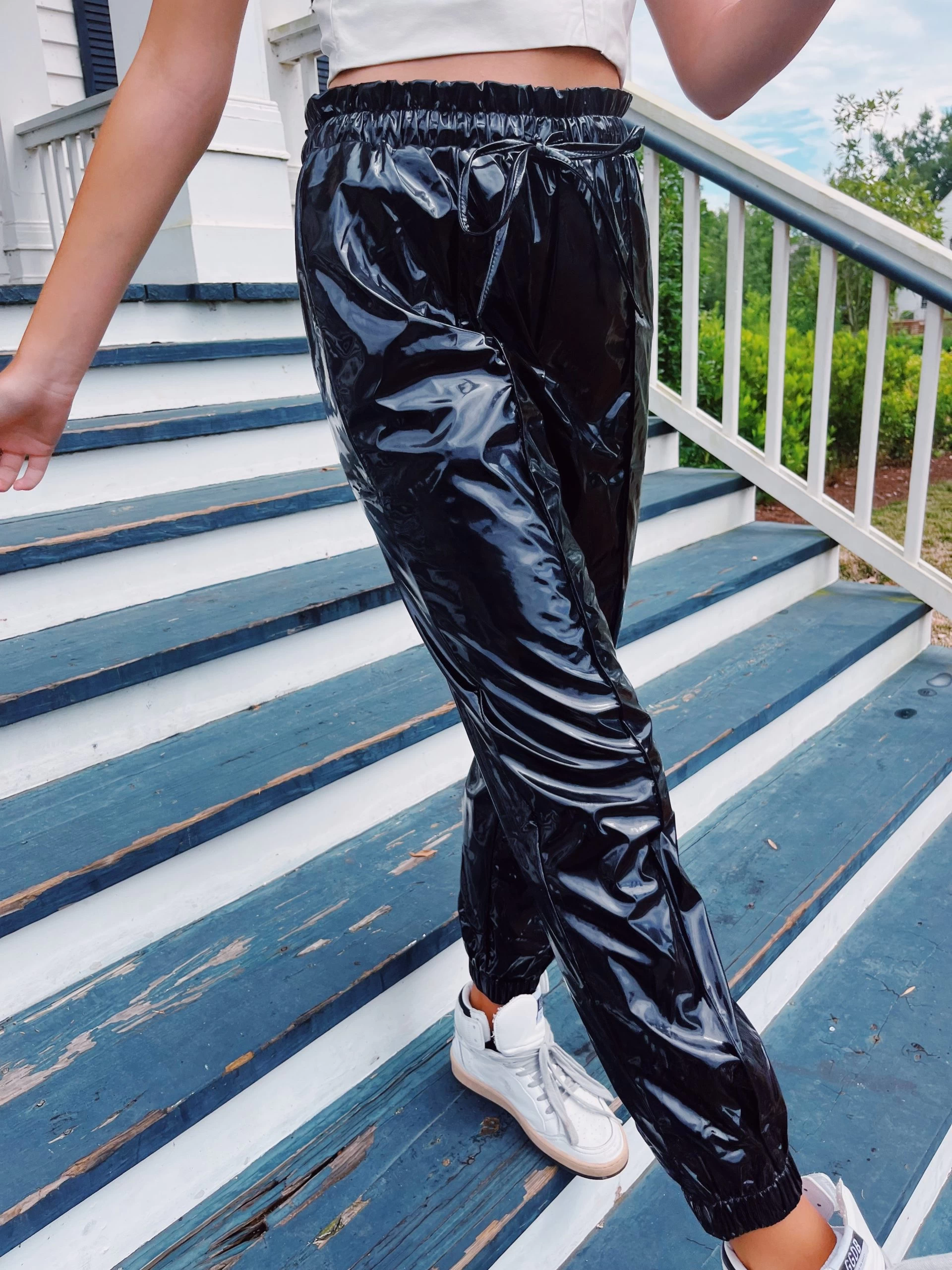Faux leather drawstring jogger pant with elastic waist and leg opening. Slant pockets.ย