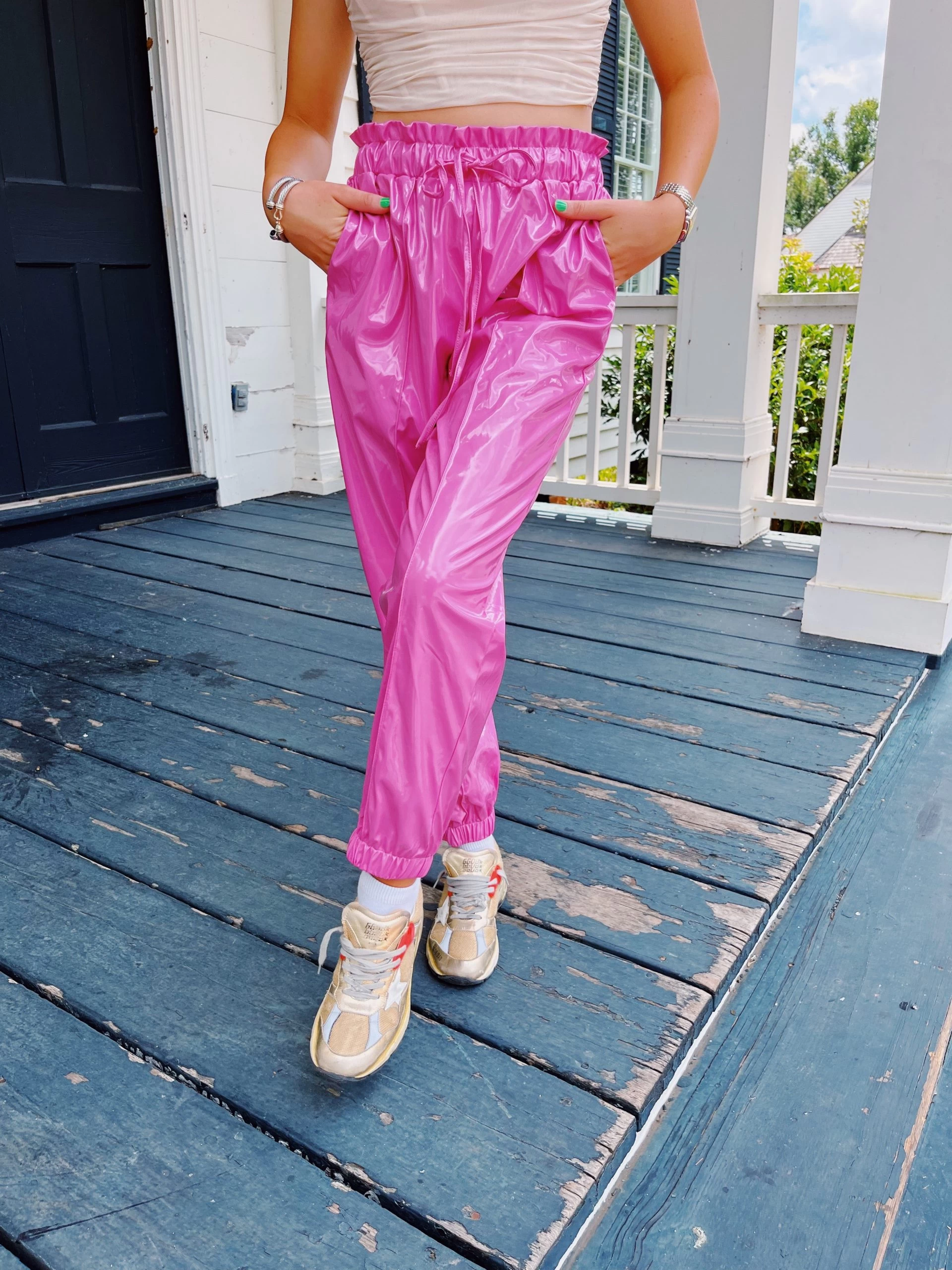 Faux leather drawstring jogger pant with elastic waist and leg opening. Slant pockets.ย