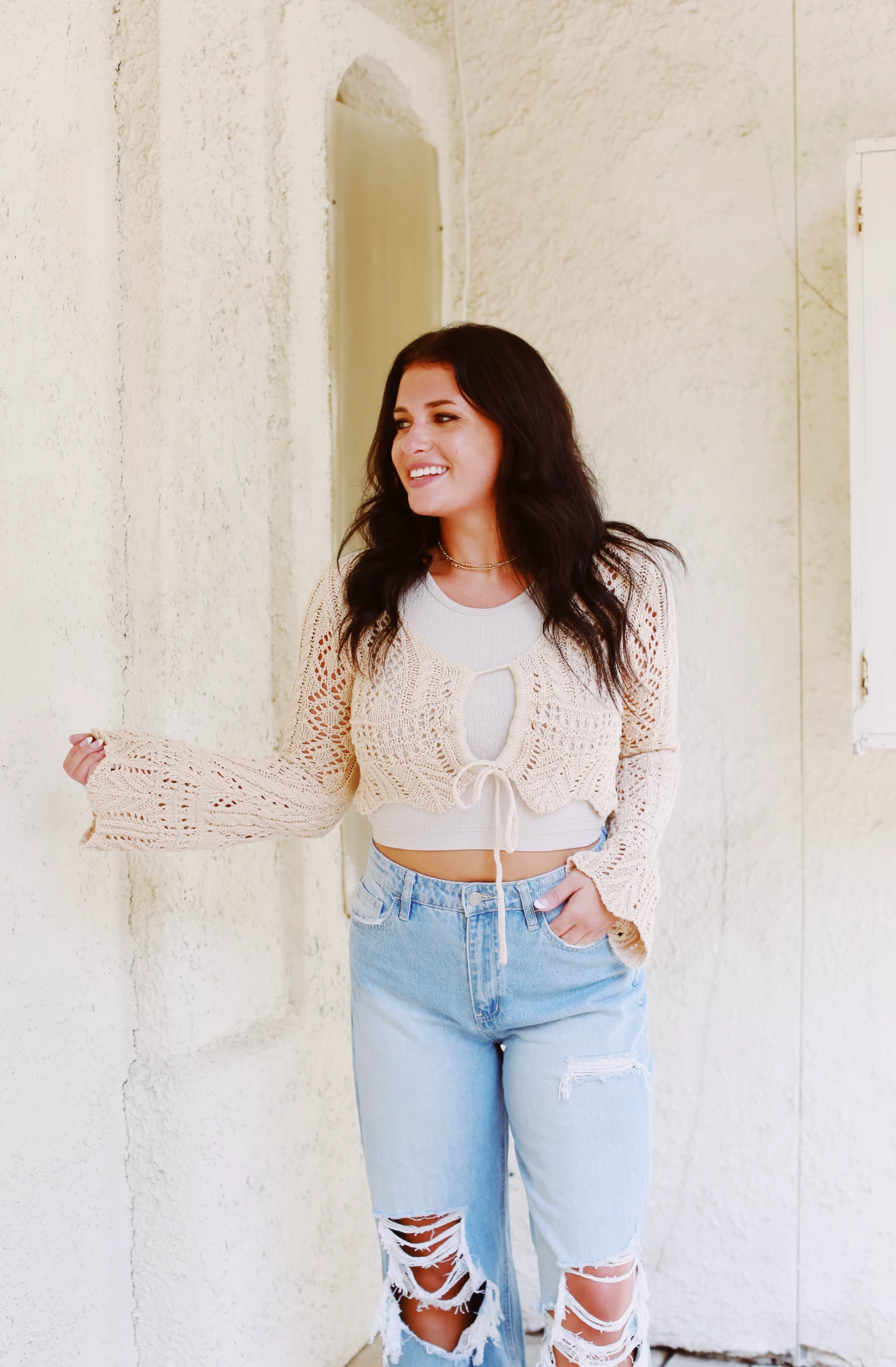 Layer your top and jeans with this scalloped-edged, cropped-short cardigan that ties in the front in an easy bow. Extra-long scalloped bell sleeves add volume and flow to this accessorizing piece. The overall sheer crochet fabrication assures lightweight coverage that shows the top underneath.