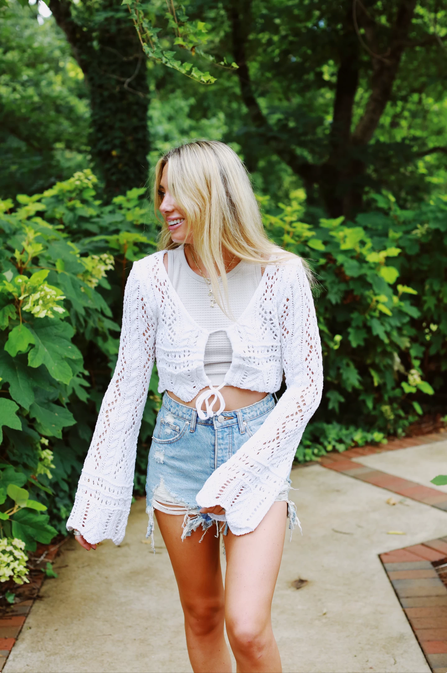 Layer your top and jeans with this scalloped-edged, cropped-short cardigan that ties in the front in an easy bow. Extra-long scalloped bell sleeves add volume and flow to this accessorizing piece. The overall sheer crochet fabrication assures lightweight coverage that shows the top underneath.