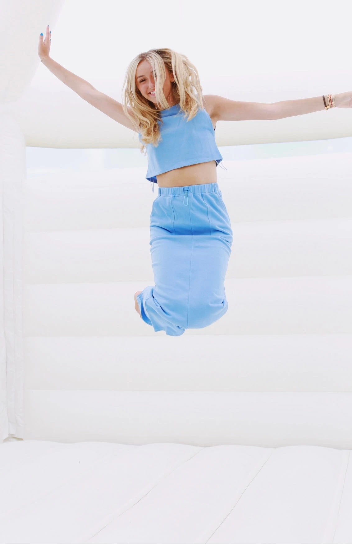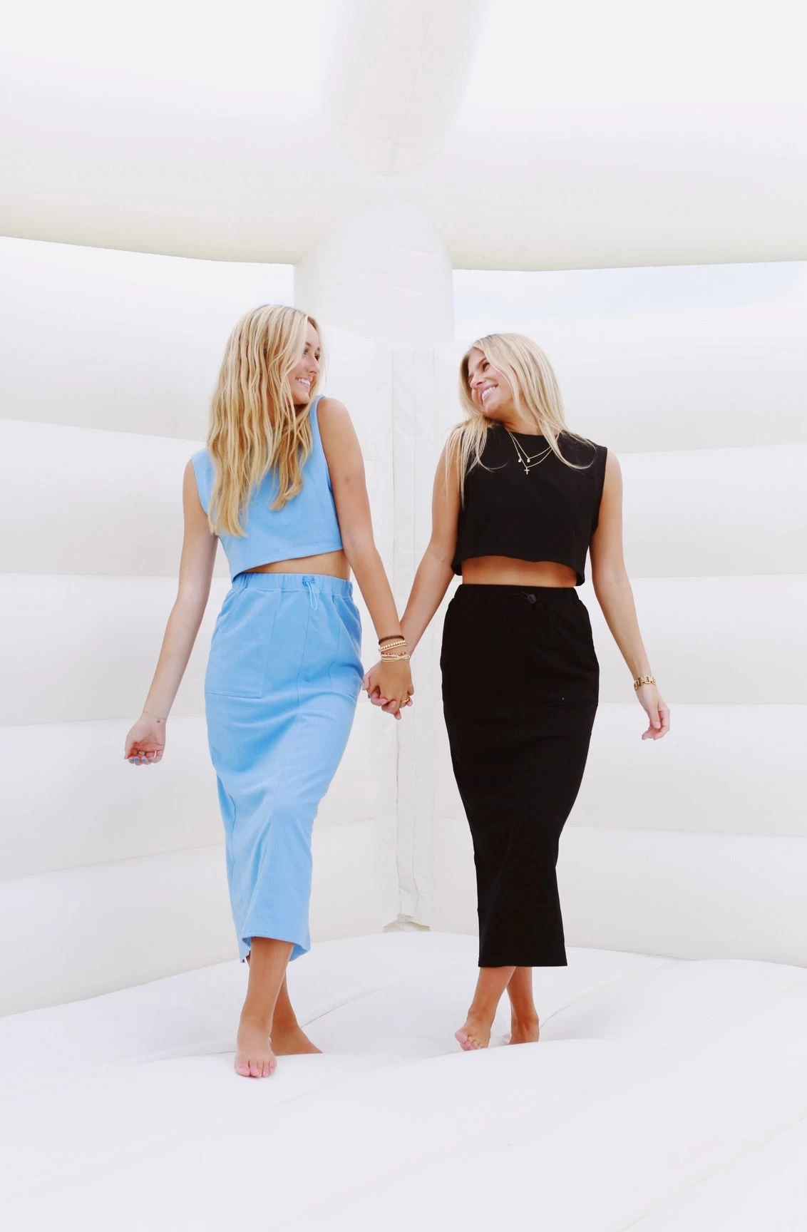 Our Caicos Midi set is a two piece set with a cropped round neck tank top and a midi skirt with pockets and a dry string elastic waist band. This set is made with comfortable fabric and is perfect for any occasion.Β