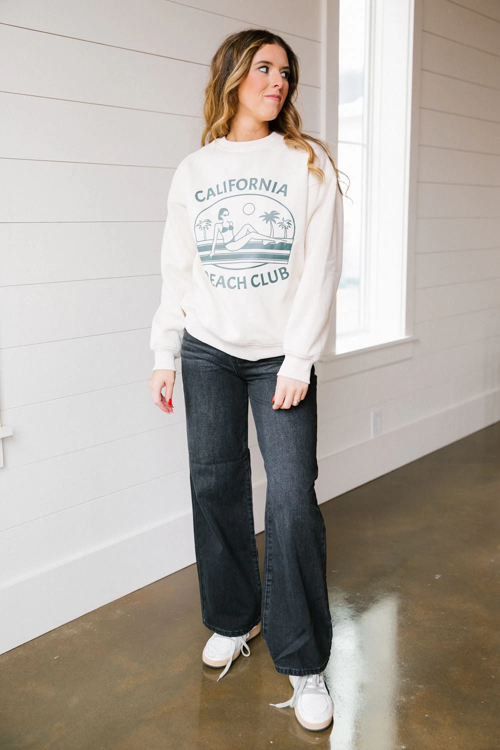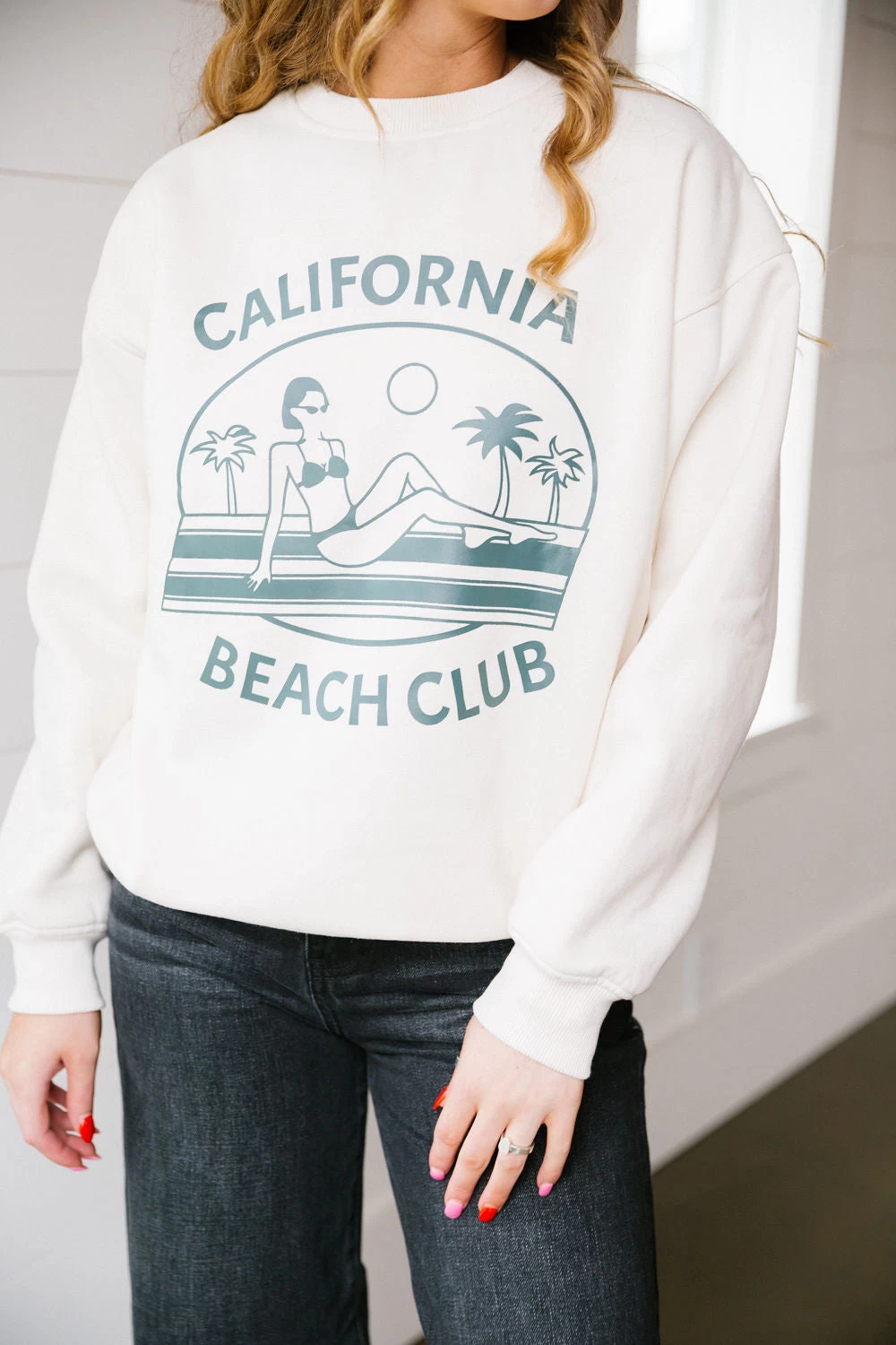 Cream colored sweatshirt with a “California Beach Club” design on the front. Model is wearing a size XS. If you want a more oversized fit we suggest sizing up.
