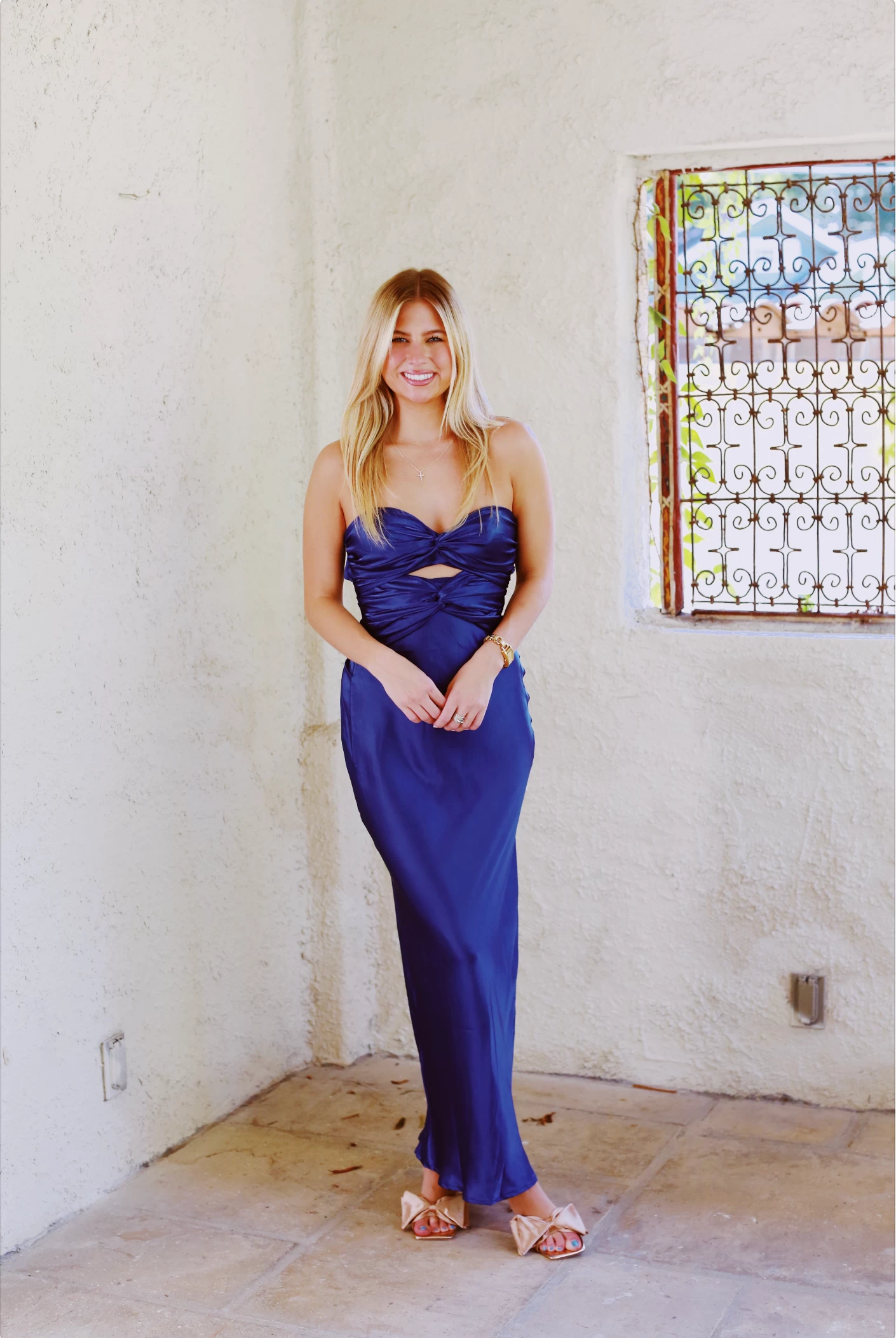 Take a bold step in the Cannon Dress and turn heads! This stand-out dress features a cut out twist front. It has a back zipper and self tie detailing. There is a band along the top to help hold up the strapless top.ย