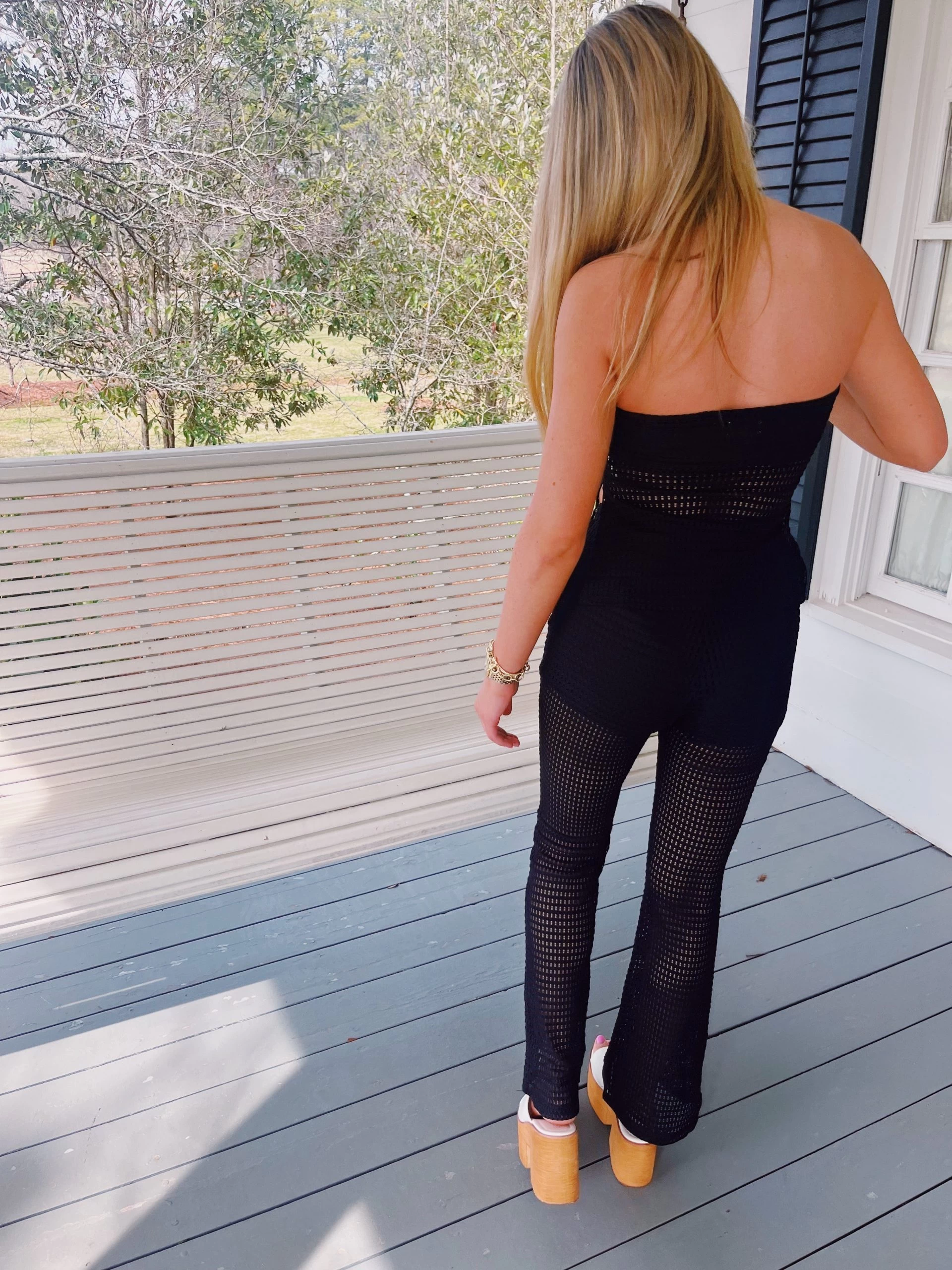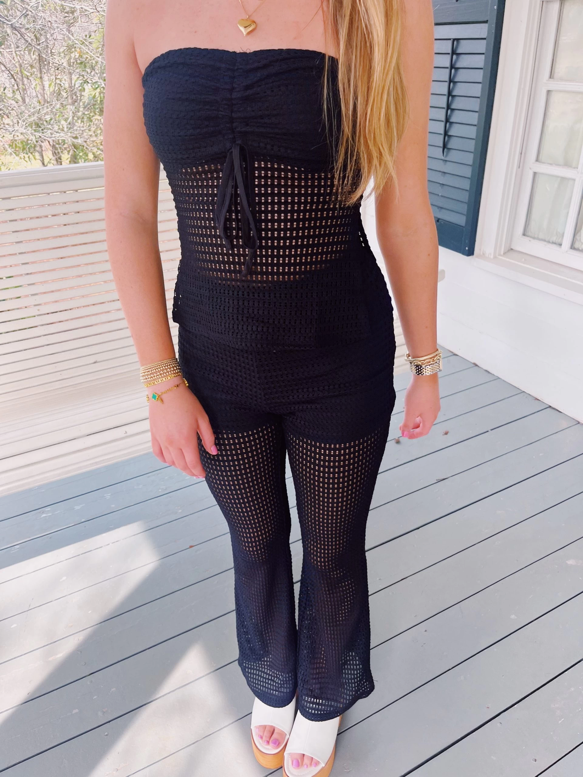 These woven bottoms and top are sure to give your look a chic finish, this set is a must-have in any doll’s wardrobe. Featuring a black woven sheer material with a flared pant and strapless top how could you say no for your perfect weekend plans, this set is sure to bring all the attitude and drama. Style this set with black strappy heels for an all-black fit that is sure to have heads turning for all the right reasons!
