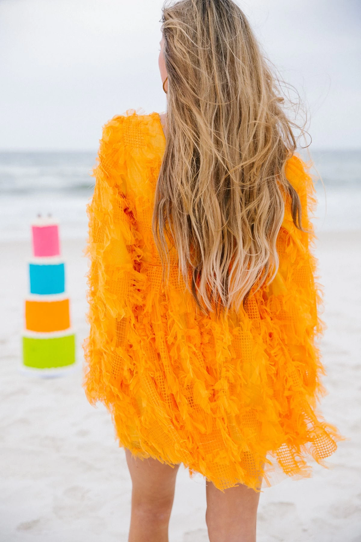 FRINGE TULLE MESH DETAIL MNI FLARE DRESS WITH LONG BUBBLE SLEEVE, V NECKLINE AND BACK ZIPPER