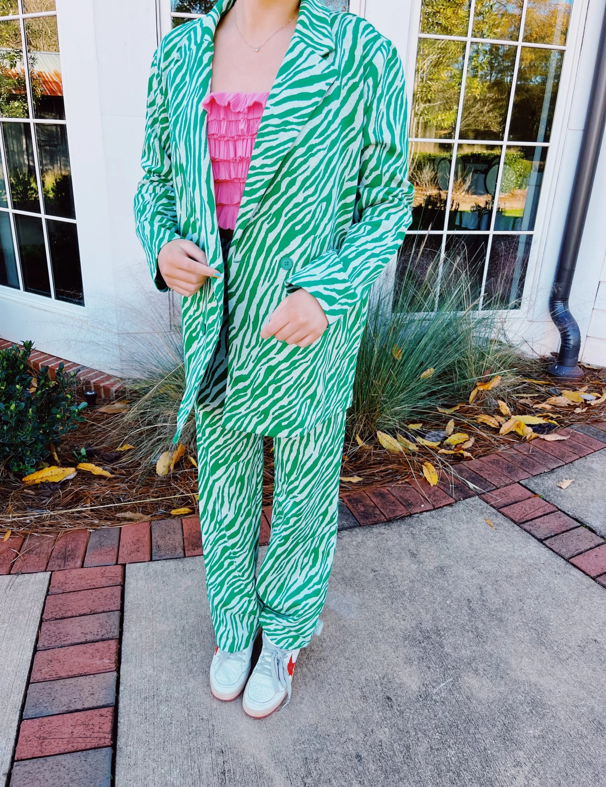Long relaxed blazer in zebra pattern on stretch knit fabric. This printed blazer features a notched collar with double breast button closure, straight long sleeves, and a pair of welt pockets. Pairs with out “Go Wild Set PANTS”