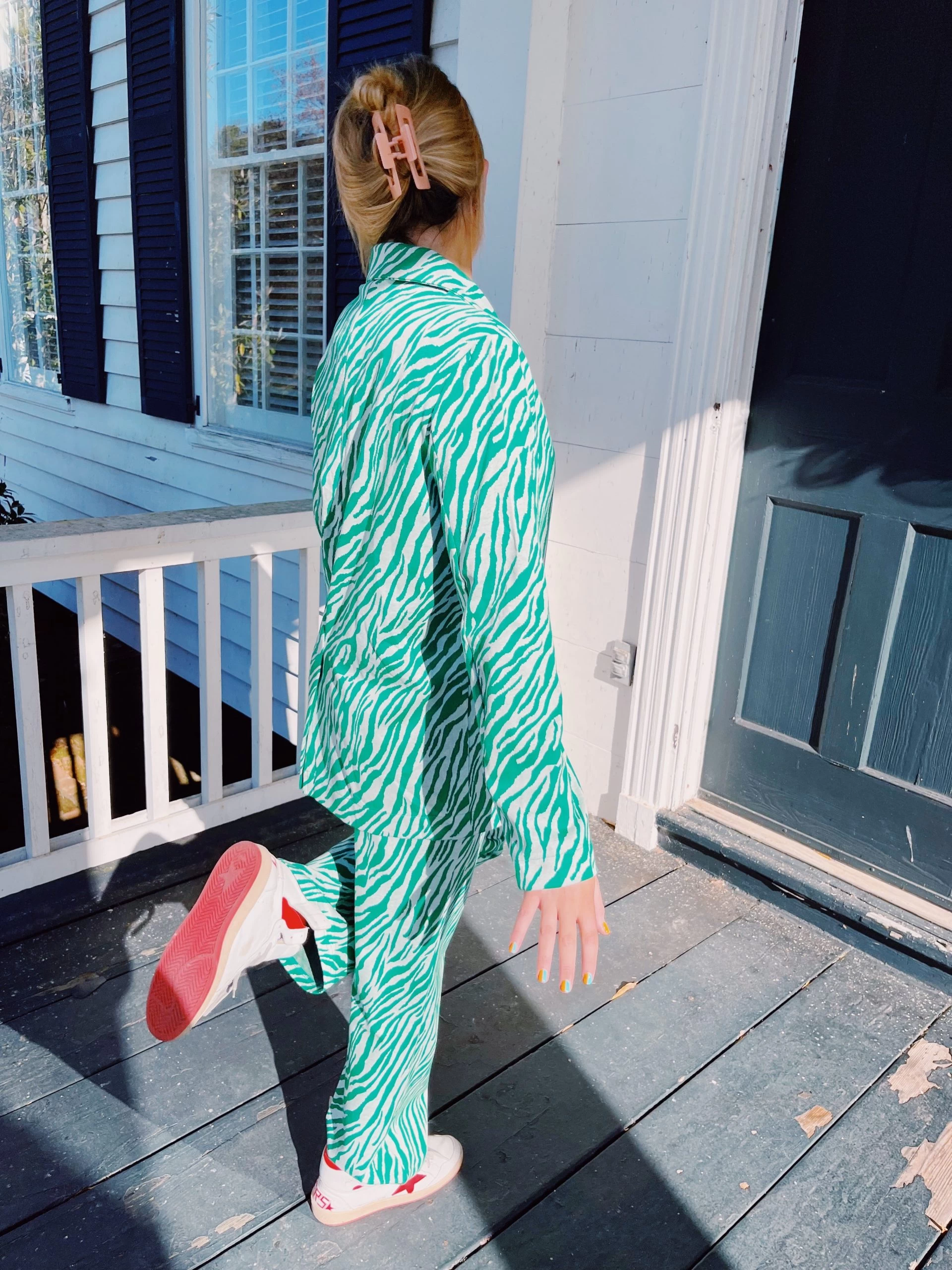 Straight leg long pants in zebra pattern on stretch knit fabric. Zebra print makes a grand appearance in this fashion-forward style with seam side pockets and elastic waistband. Pairs with our “Go Wild Set Blazer”.