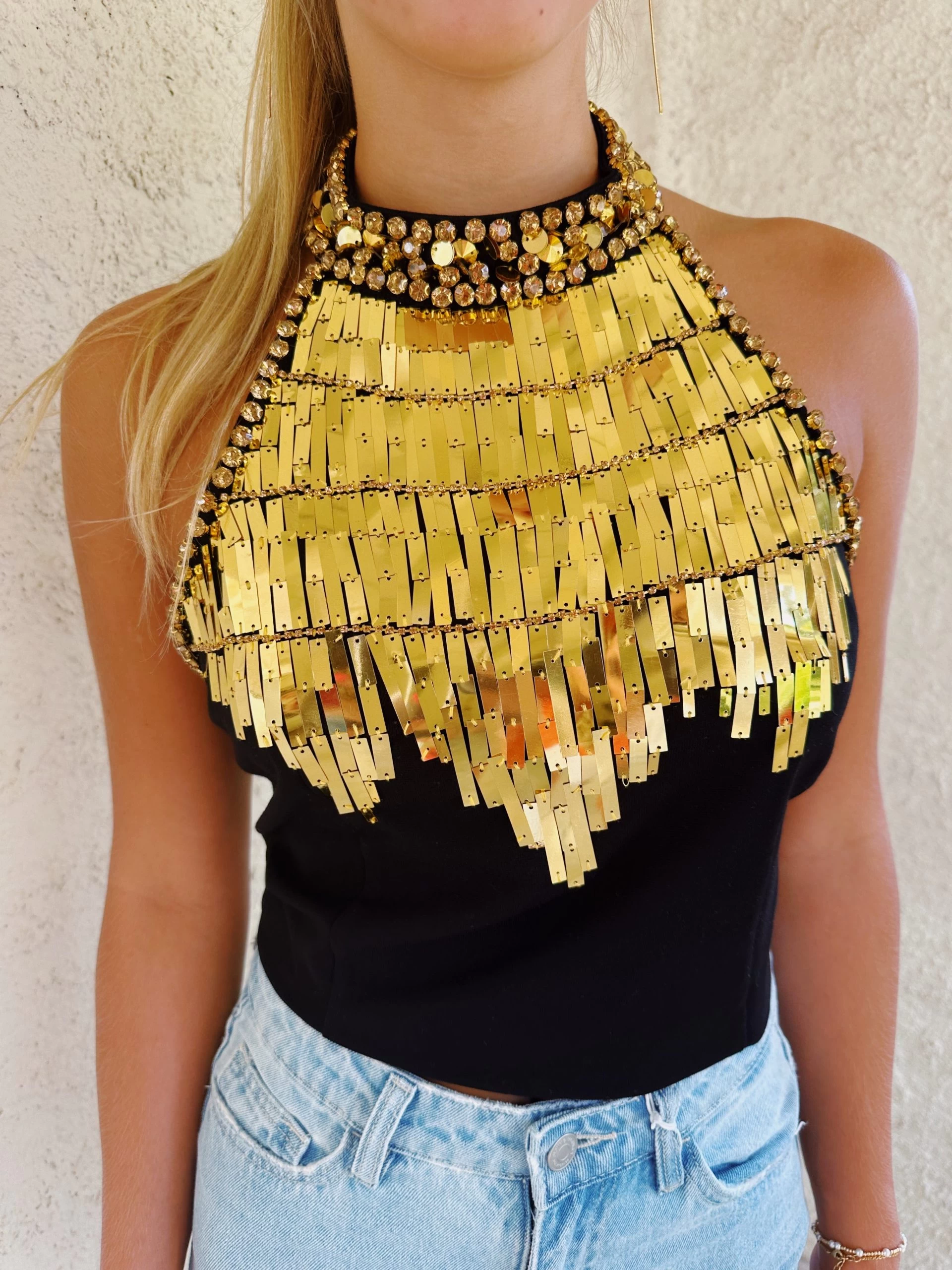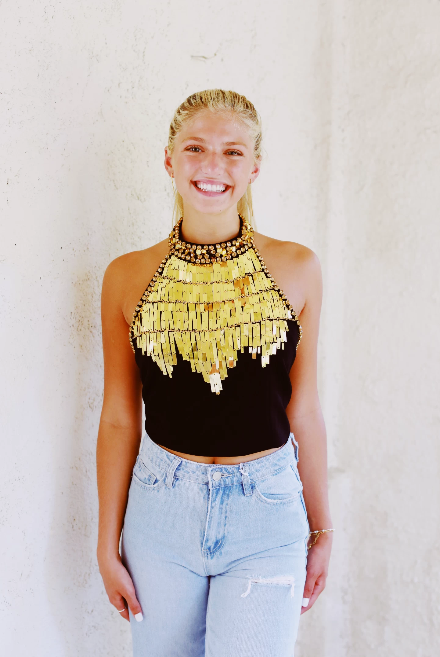 This top is a SHOWSTOPPER! It is a black halter neck top with gold embellishments and rhinestone trim along the sides and top. Due to the make of this top with all of the little stones and gold pieces, it is fragile and may have small imperfections after wear. DO NOT TUMBLE DRY! Hand wash only.