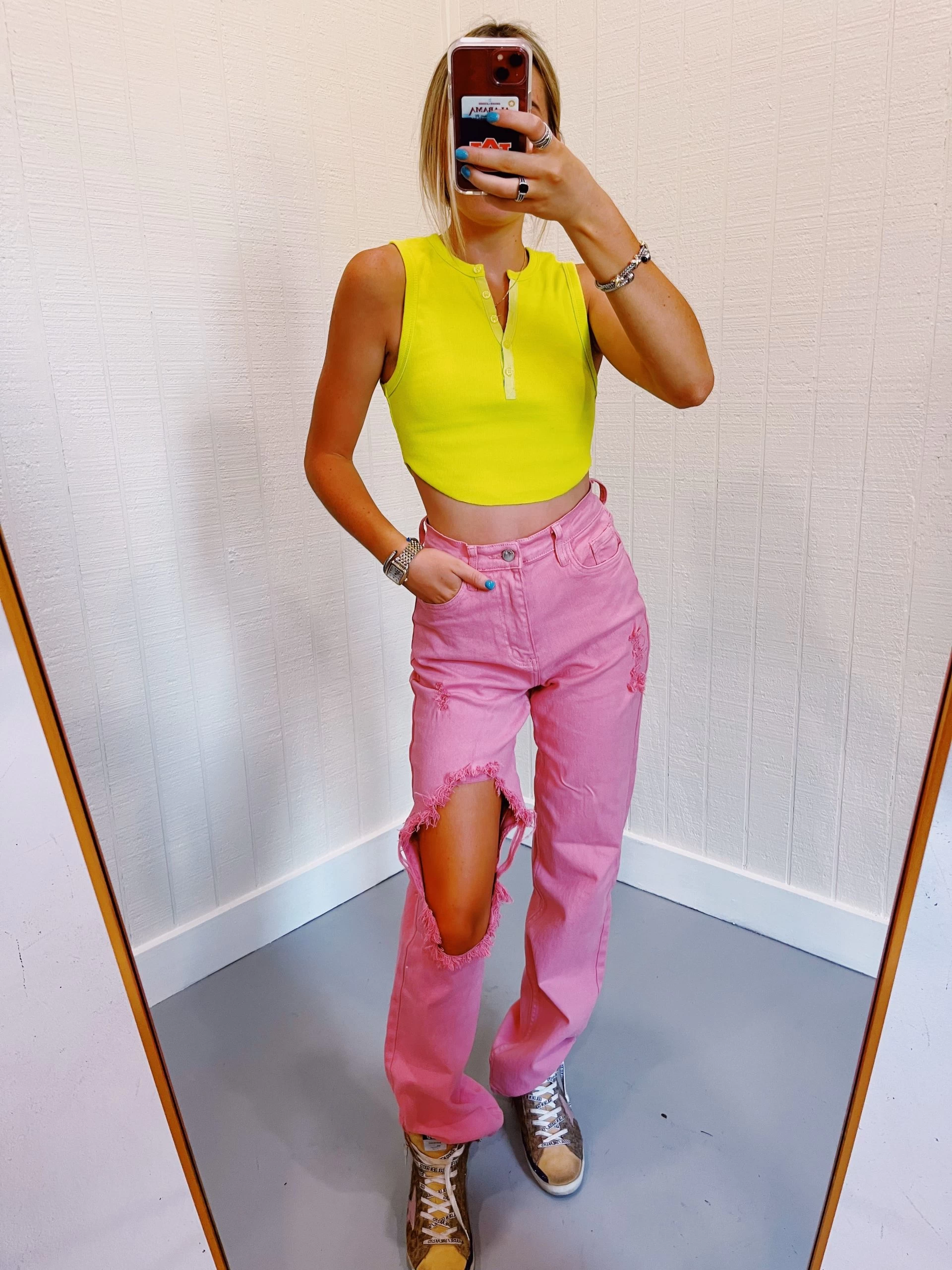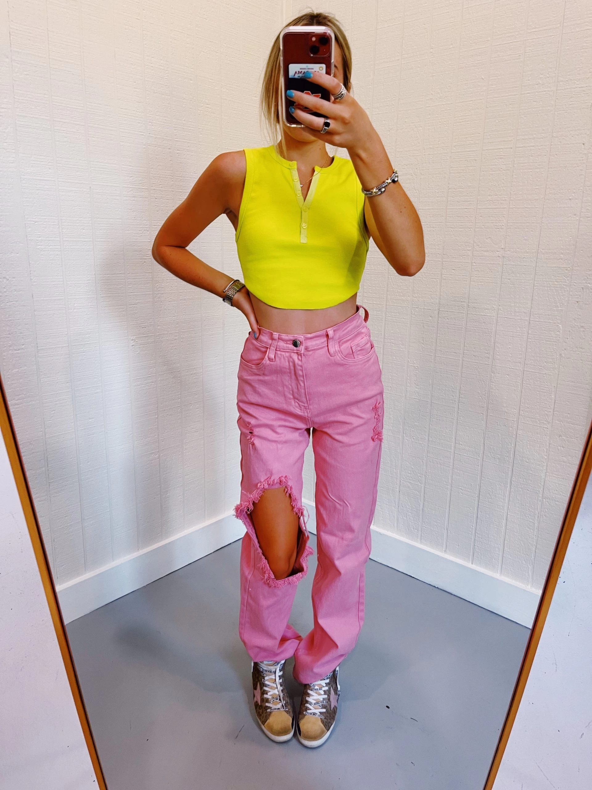 Blush colored dyed jeans with distressing areas