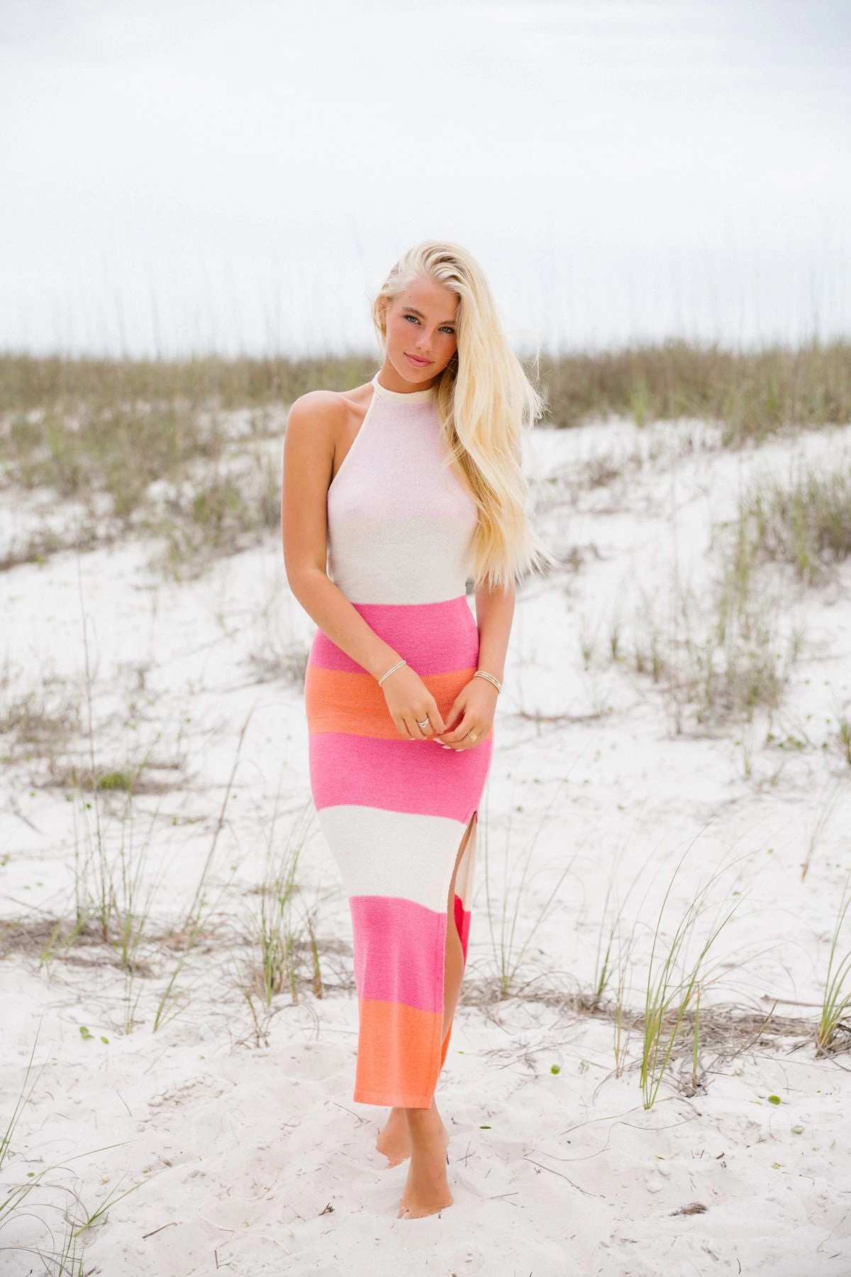 Wear it to dinner with the girls or on date night! The Landon Knit Dress is made from a knitted cotton fabric in blue, aqua and white hues. It is a partial backless style featuring a halter neck, tie detail at the neck and midi length with slit. Paired with our Bear Wedge.