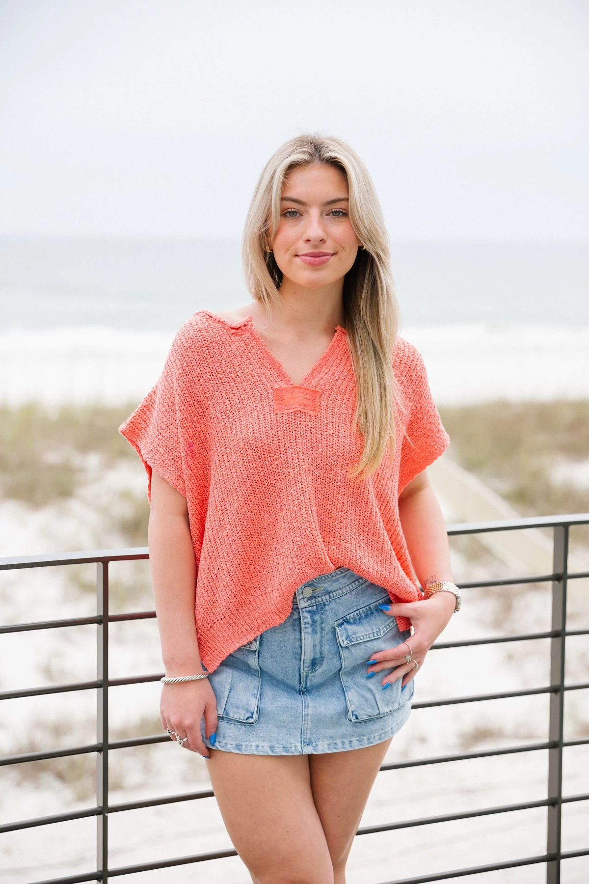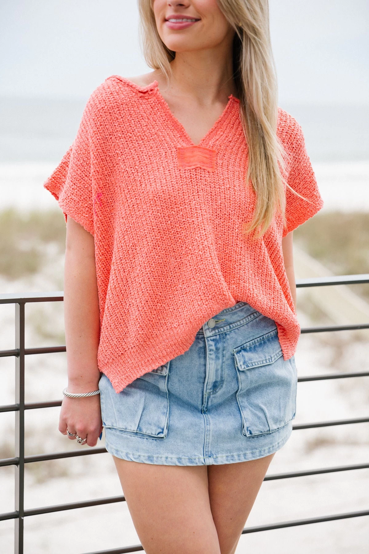 Our Lena knit top is a loose fit, slouchy, slightly cropped sweater featuring v-neckline, sleeveless, and solid front and back patch.