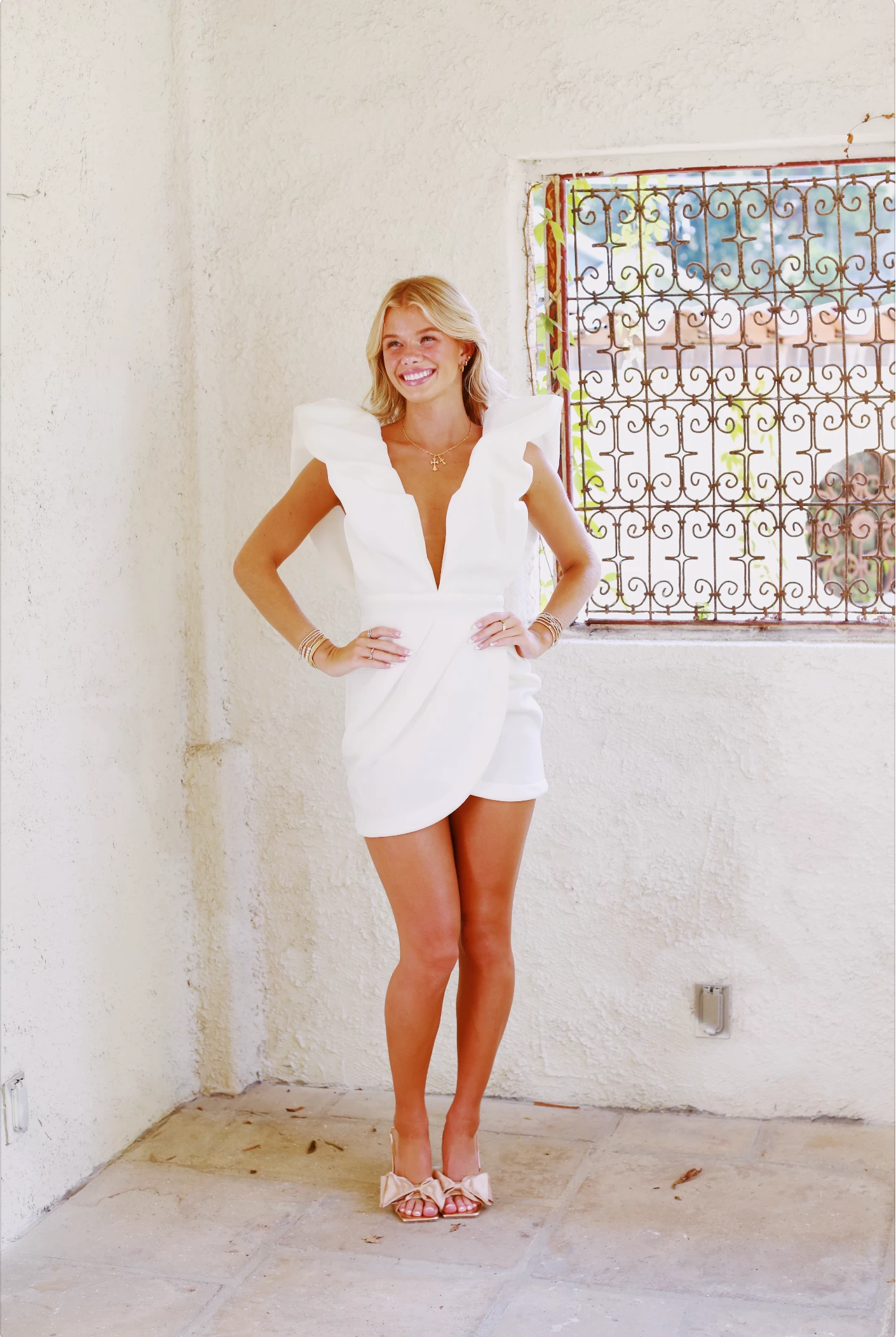Scuba deep v-neck puff sleeve mini dress with tulip skirt and open back detailing. Back invisible zipper. Model is wearing a size small! This style runs shorter!ย