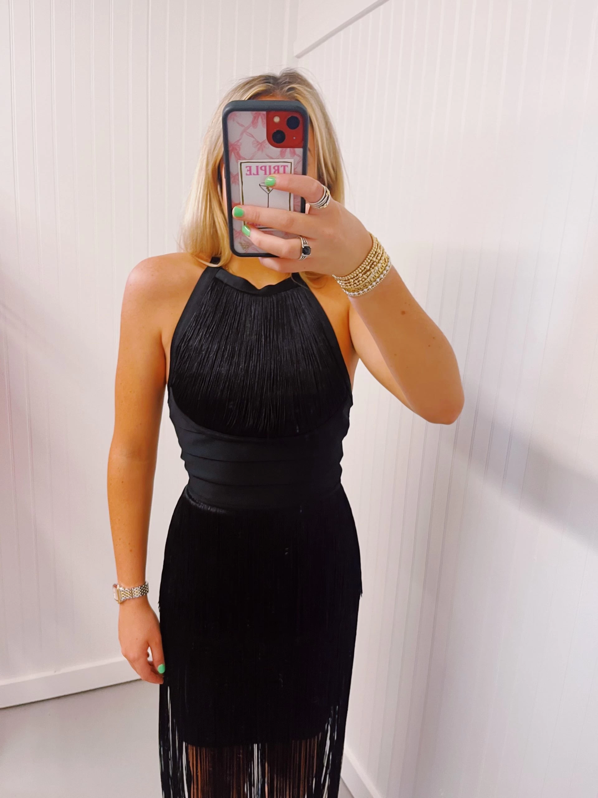 We are in awe with this dress! The halter neck design paired with fringe detailing is simply stunning! The bodycon cut is sure to turn heads! This dress is layered with fringe detailing. The dress features an open back. Pair with your favorite heels to complete a perfect look!