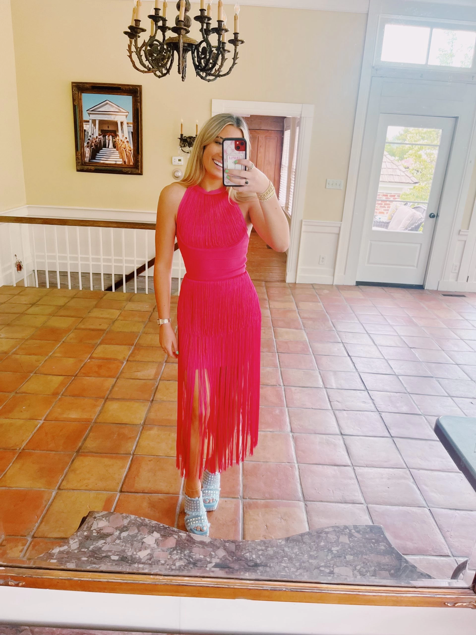 We are in awe with this dress! The halter neck design paired with fringe detailing is simply stunning! The bodycon cut is sure to turn heads! This dress is layered with fringe detailing. The dress features an open back. Pair with your favorite heels to complete a perfect look!