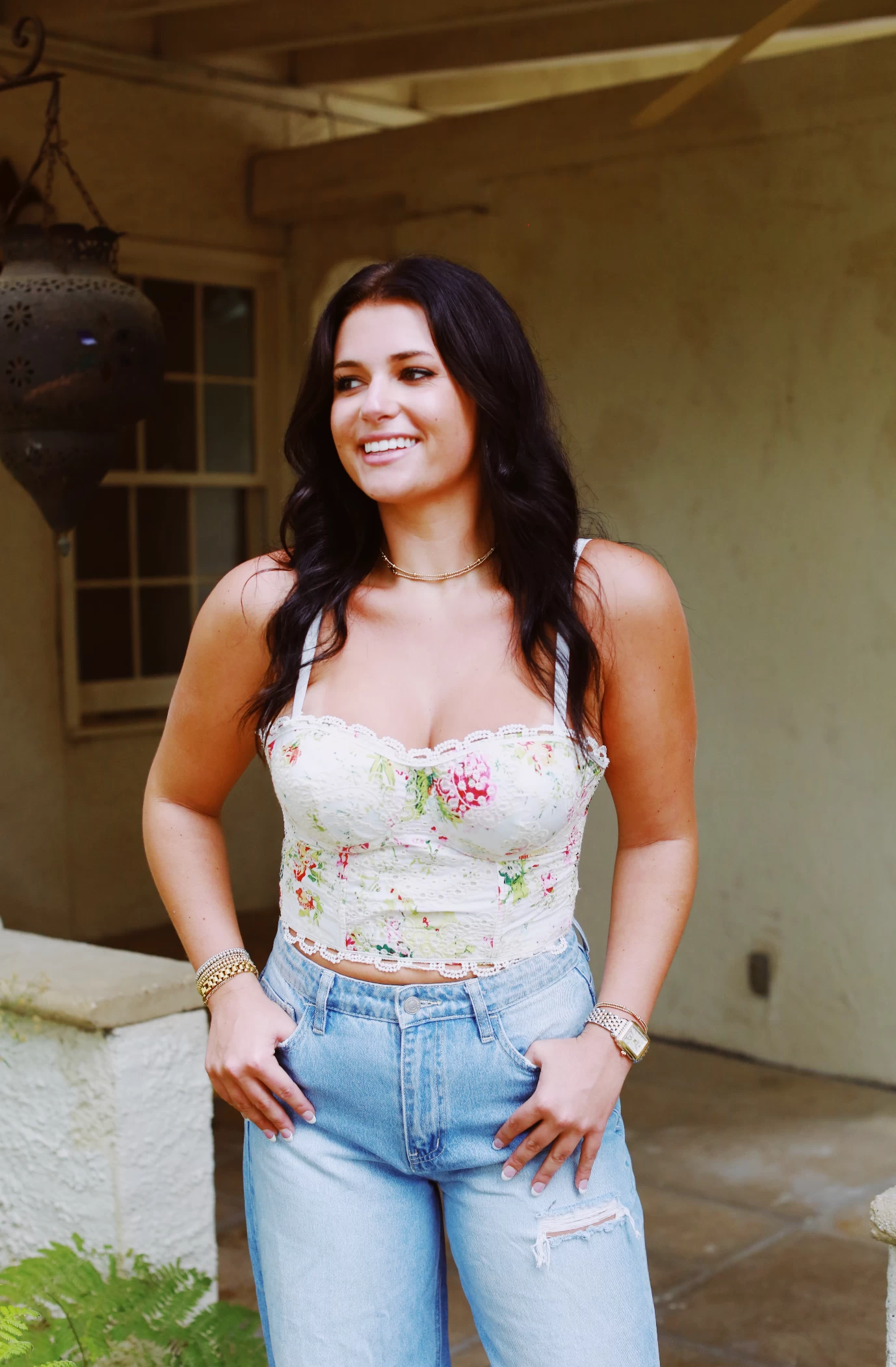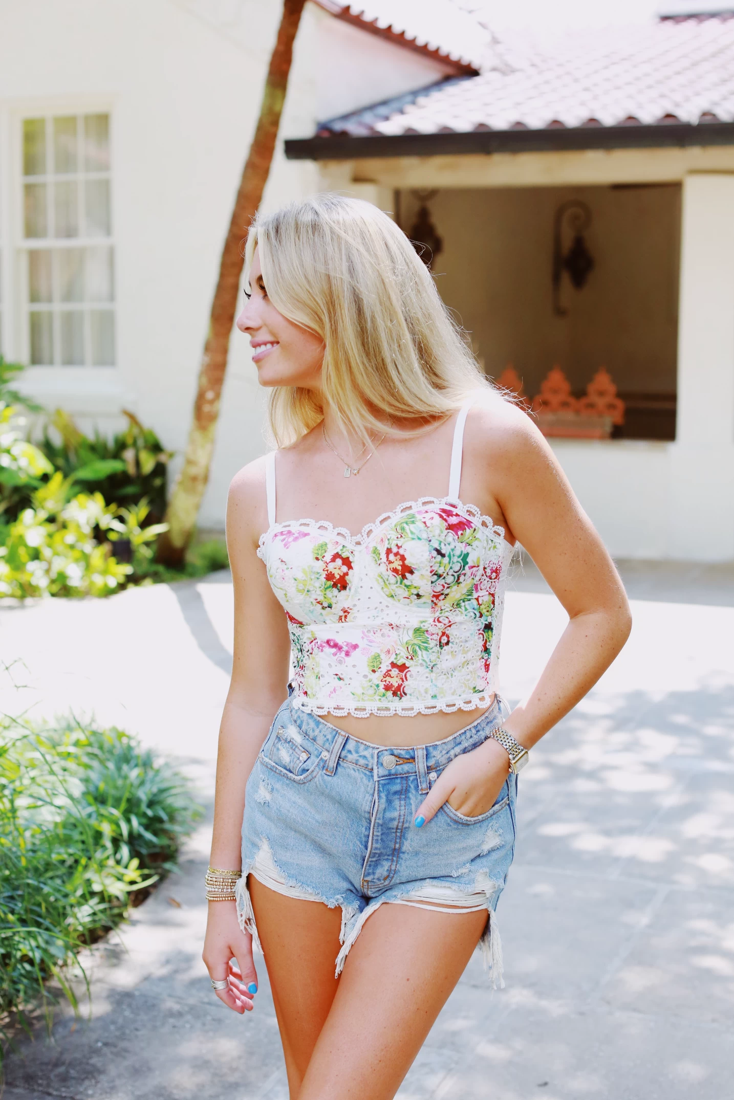 Wow them in the stunning One Night In Paris Bustier Top; this top is a show-stopper! The floral print and lace trim make for a fun combination, while the bustier corset top adds a touch of sass. Get ready to turn heads in this beauty! It has adjustable removable straps for an easy fit and to change up the look. The back closure is a corset hook and eye clasp style. The bands around the edges of the top are elastic to help secure the top well!