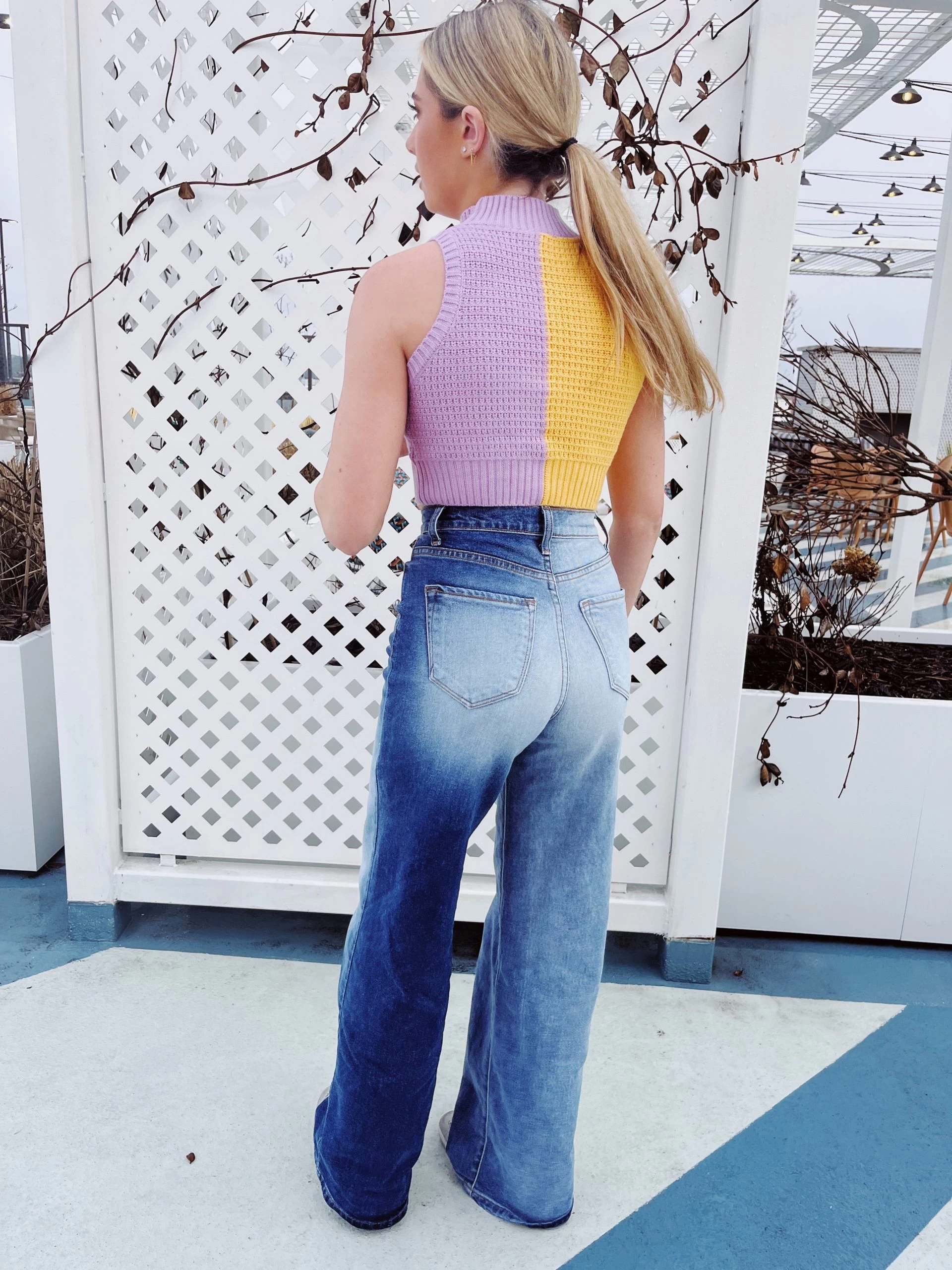 Monochromatic cropped knit top. It shows a turtle neck, it’s sleeveless, and has a fit body. It also has large ribbing on the neck, armholes, and hem.