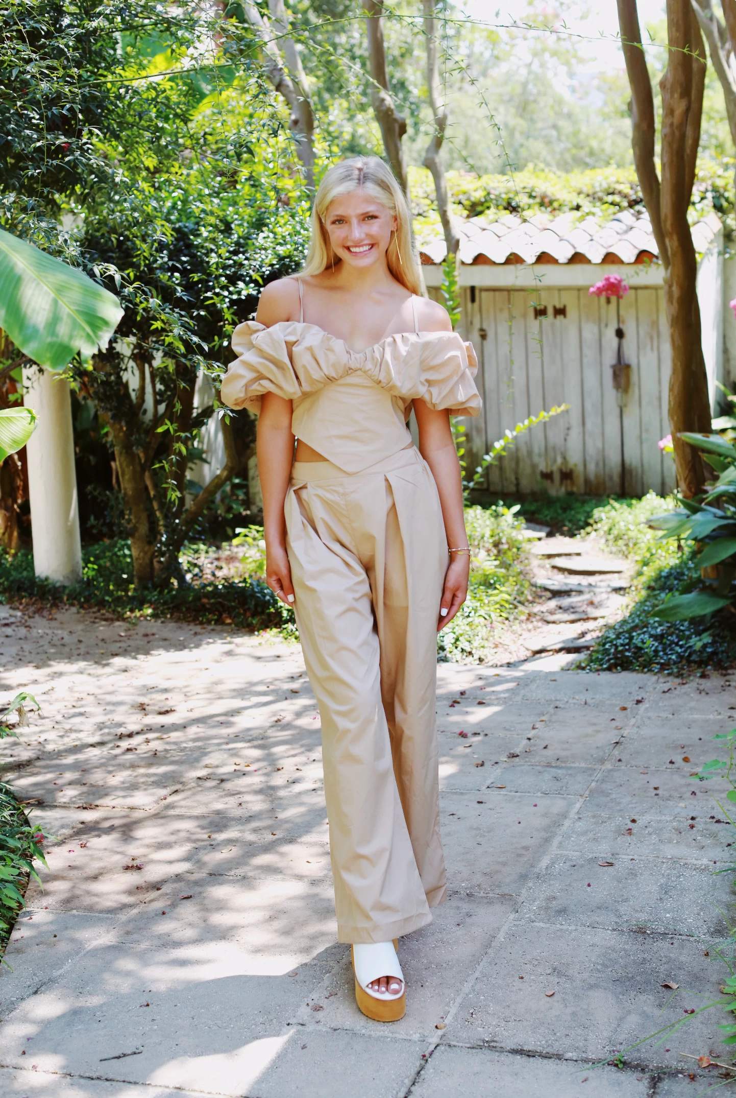This Paige Two Piece Pants Set is the perfect outfit for any occasion. Crafted with adorning cold shoulder details, this set is a chic look that will elevate your wardrobe. The top features a back zipper with adjustable straps and is double-lined, while the pleat-front pants have an elastic back waistband for unbeatable comfort. Feel incomparable elegance with this stylish set!