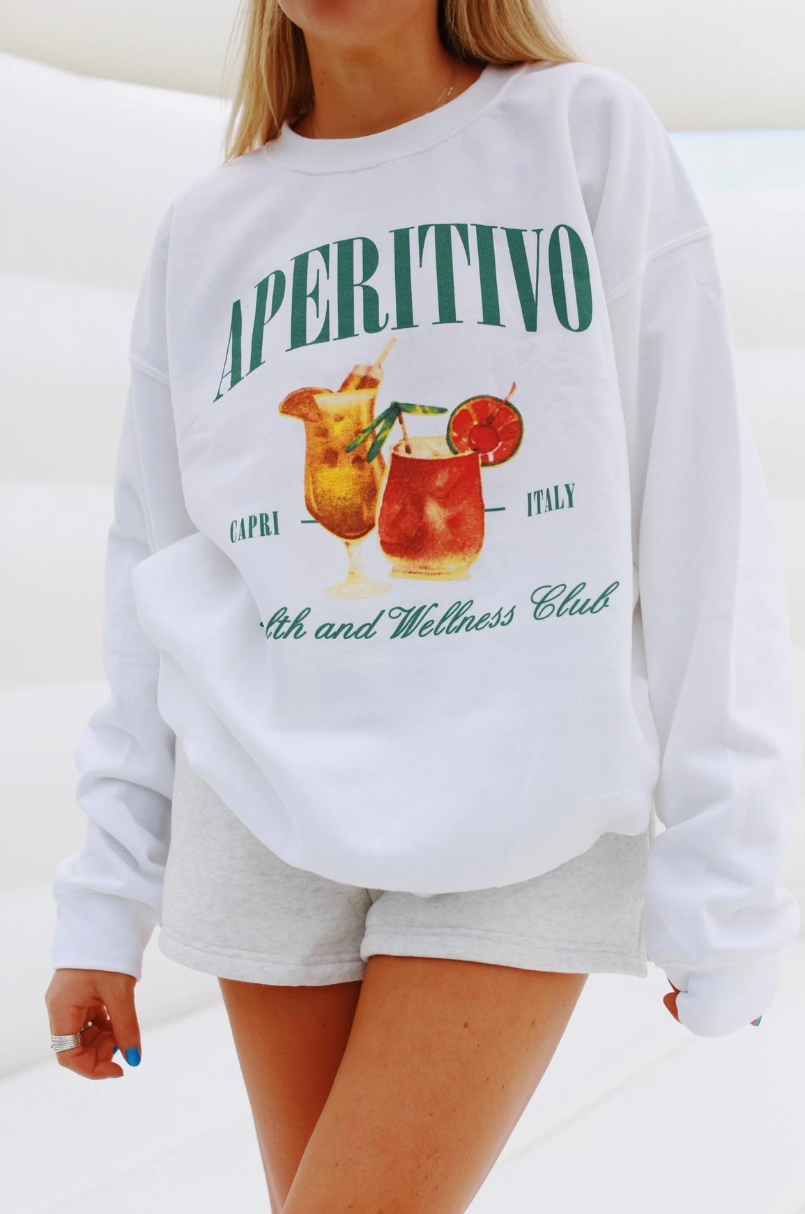 Throw on and go in this “Aperitivo” graphic crewneck! This cute design gives Italian vibes all year long. Enjoy a cocktail or lounge on the couch in this crewneck. Model is wearing a size large for a more oversized fit.