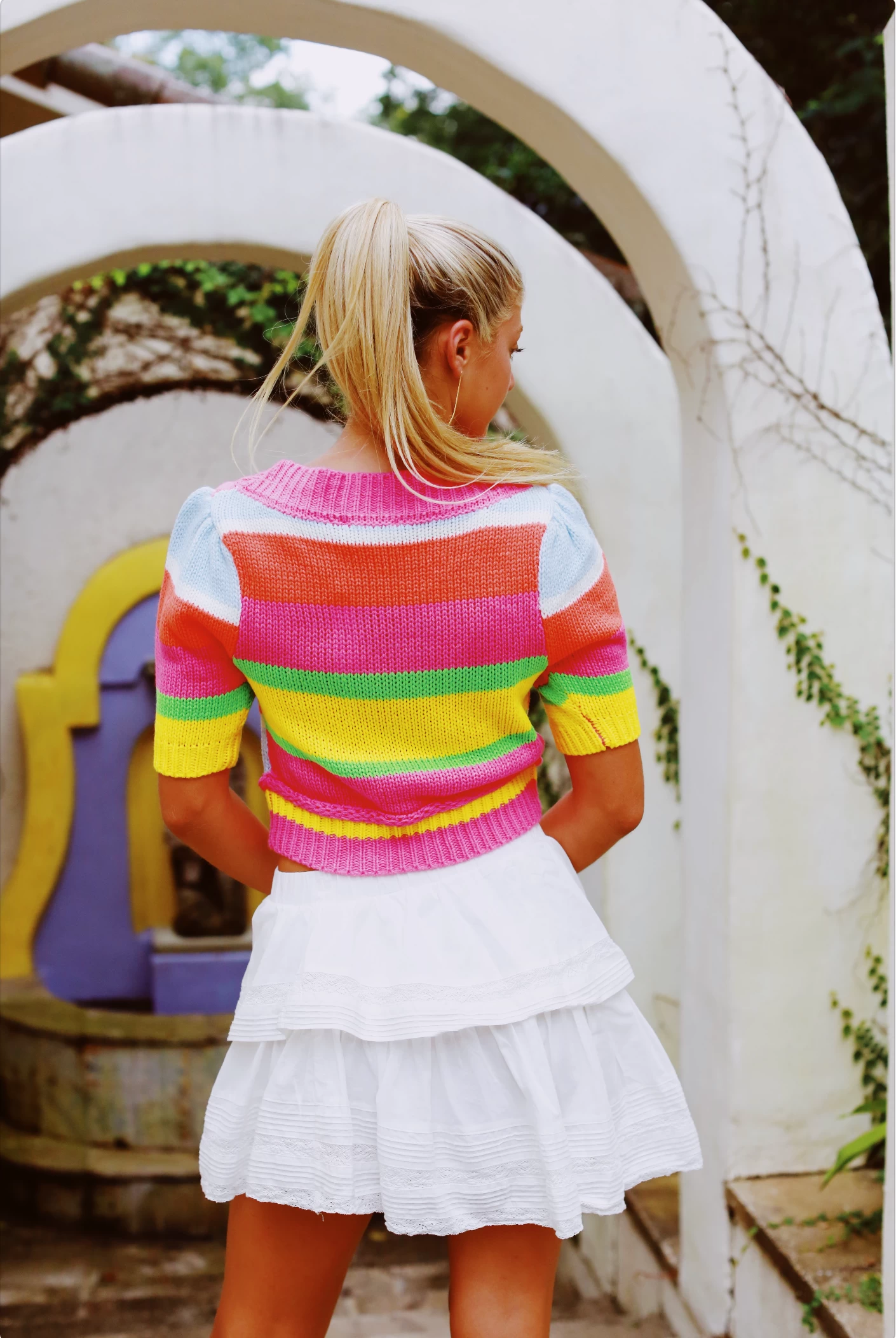 Are you looking to stand out in a sea of solids? Look no further than this vibrant, patterned stripe sweater! This multi-colored, striped short sleeve sweater is sure to make a statement!