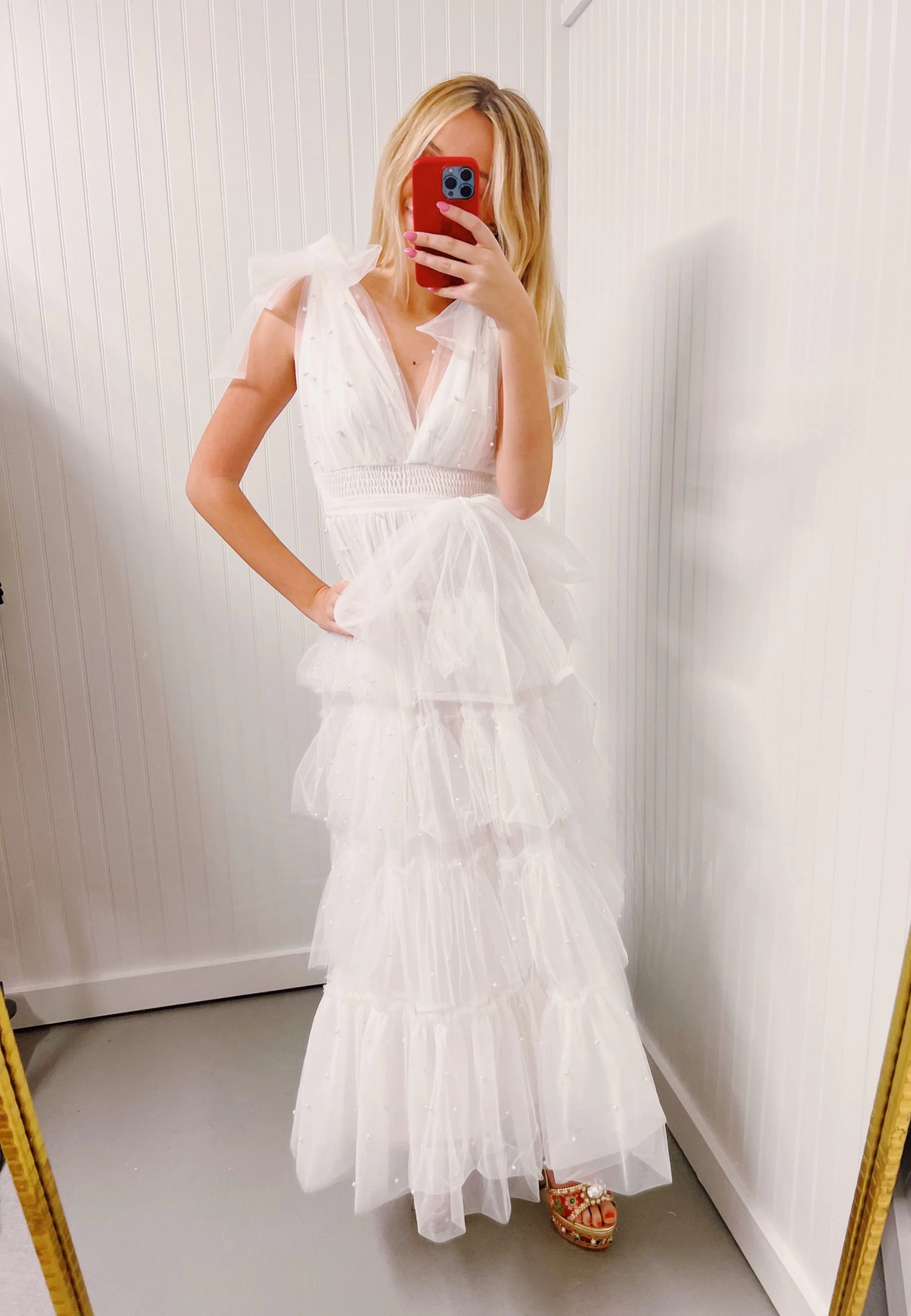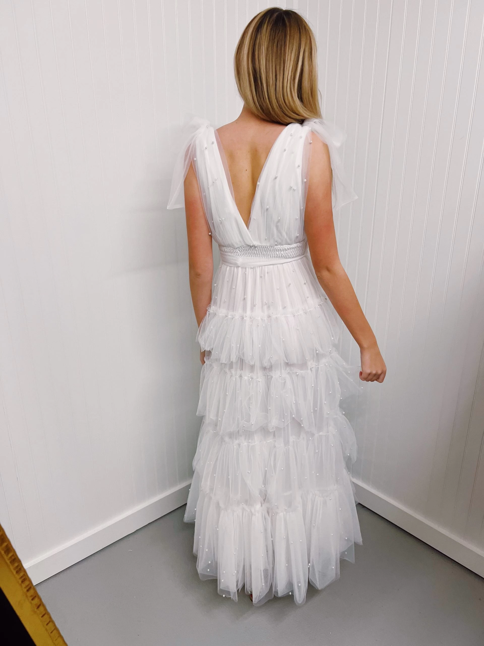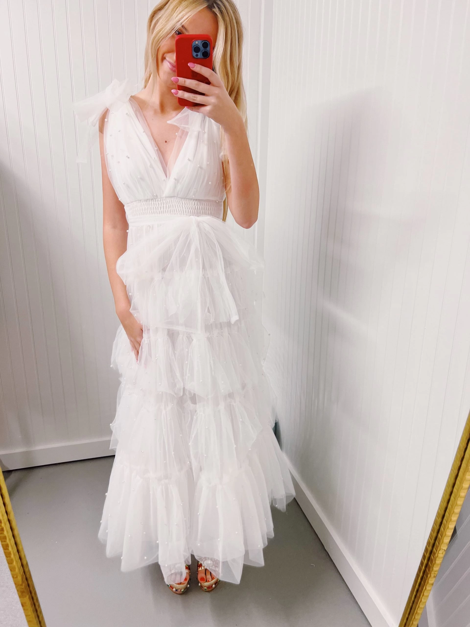 Tiered maxi dress with pearl studs on top of the mesh layers!