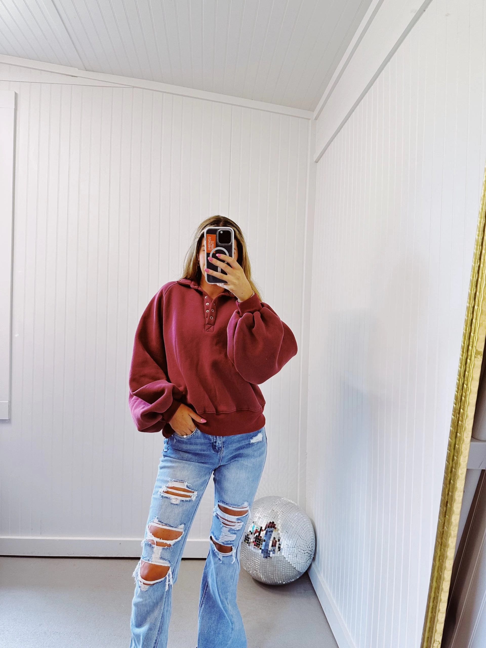 Piper Snap Button Collared Sweater with a washed effect and relaxed fit! Model is wearing a size small.