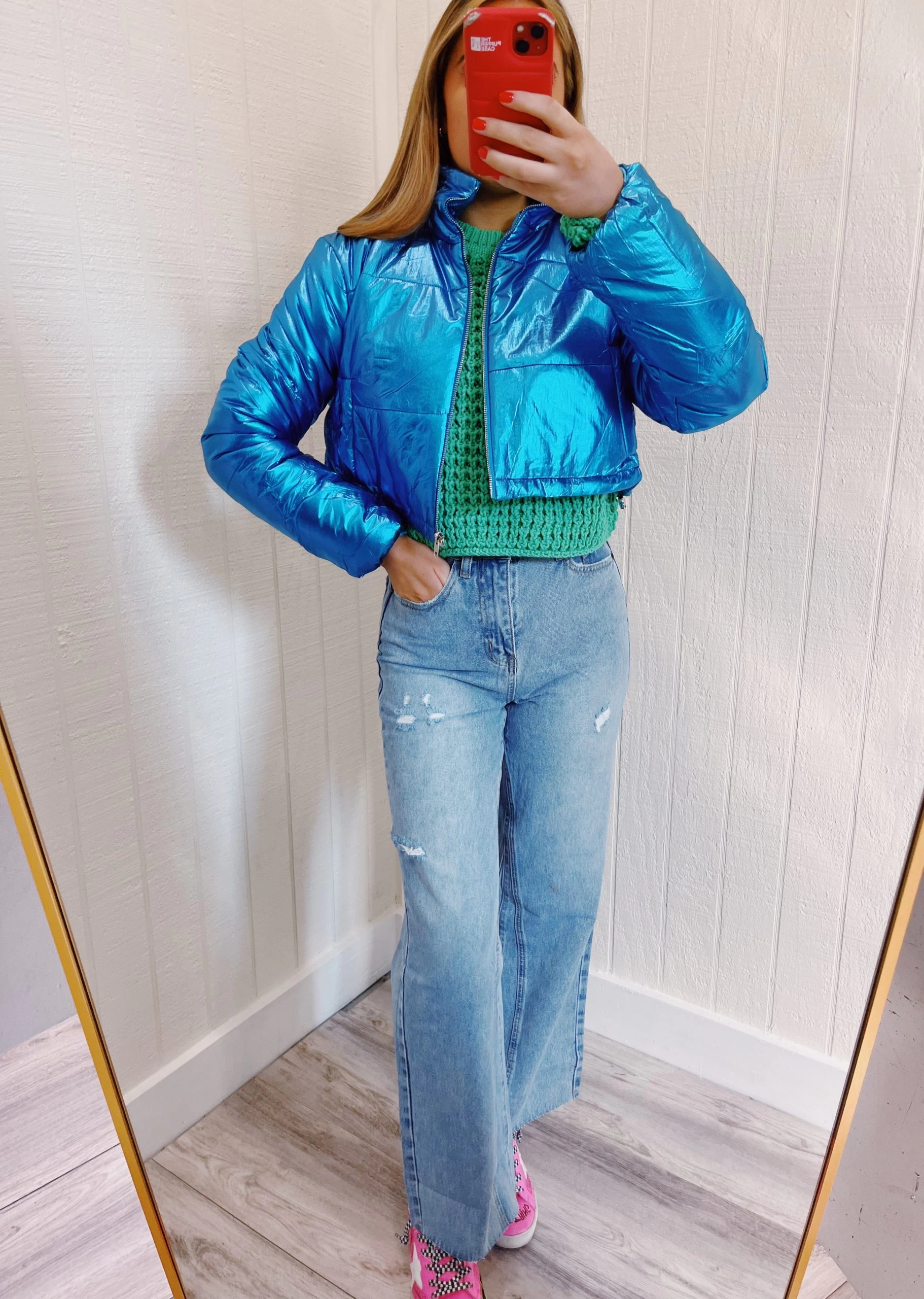 A cropped latex bomber jacket with front zipper closure and side pockets.