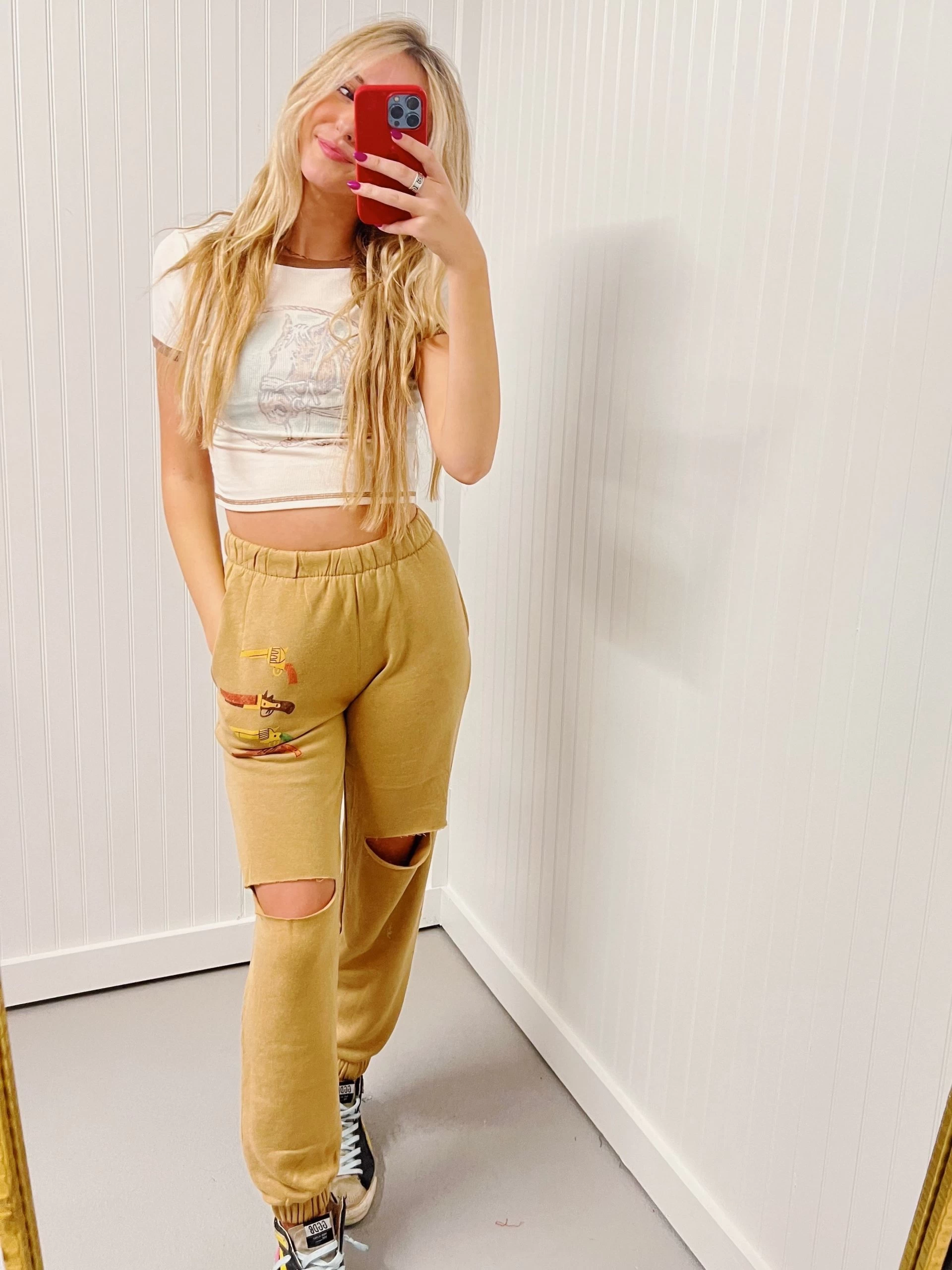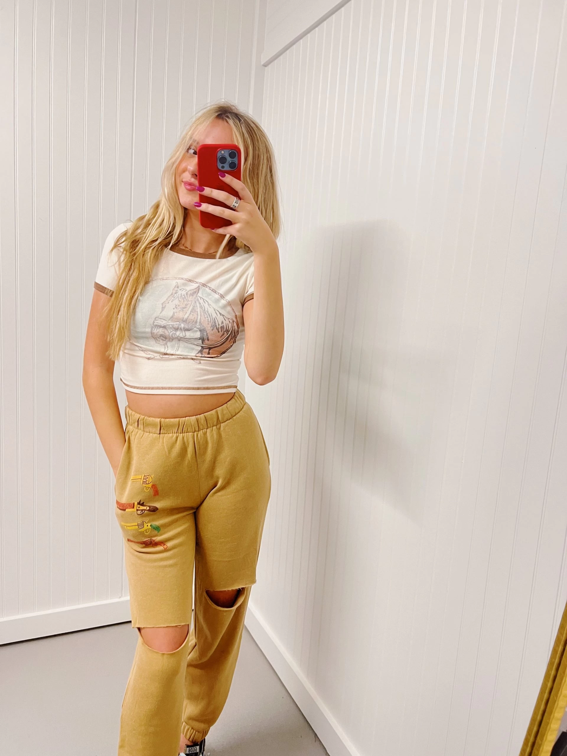 The Racking Horse Tee features a reverse stitch hem and a cropped length. Pair this tee with our Fire Away Joggers for a cute relaxed fit!
