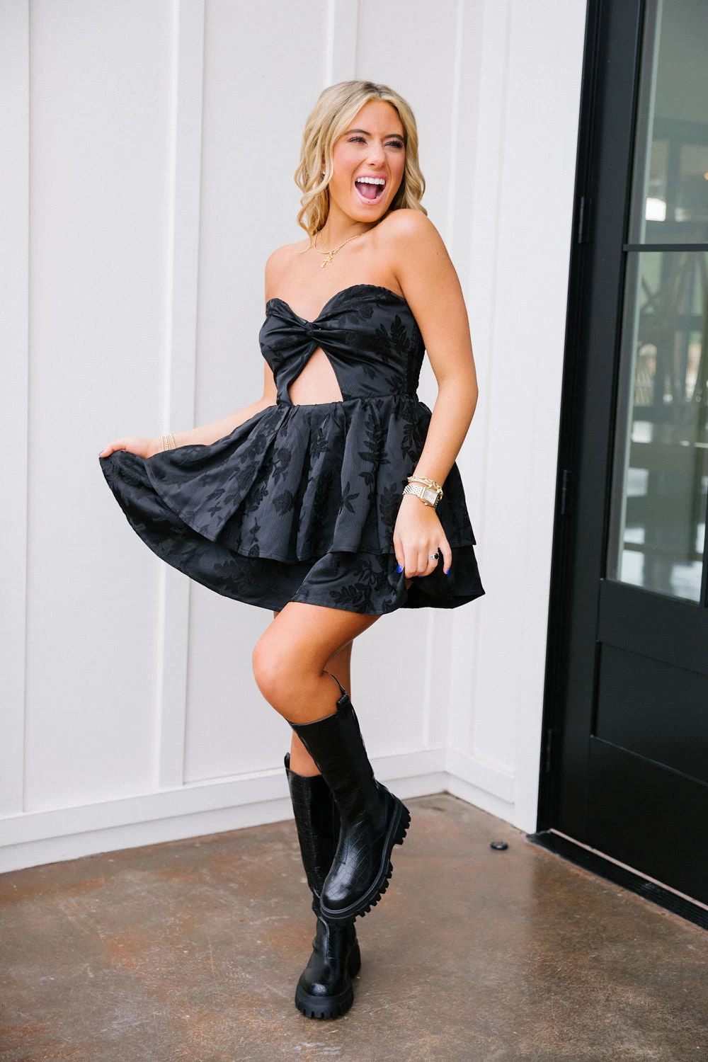 All eyes on you in this classy yet sexy cutout ruffle tube dress. This sultry mini was carefully crafted in our heavy black fabric. Pair this with your favorite heels for a night out!