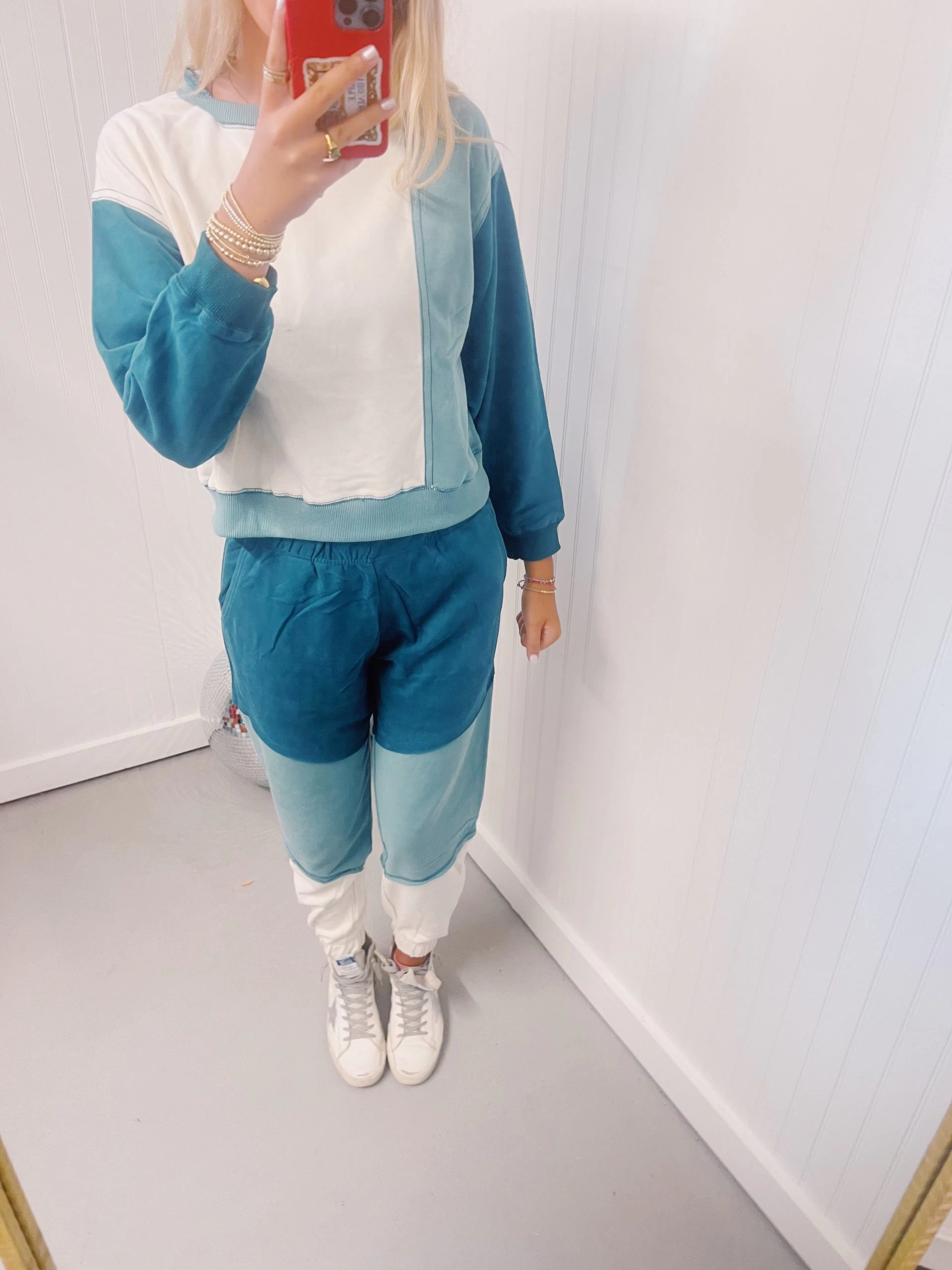 Colorblock sweat set with a pair of comfy joggers and cute and comfy sweatshirt!