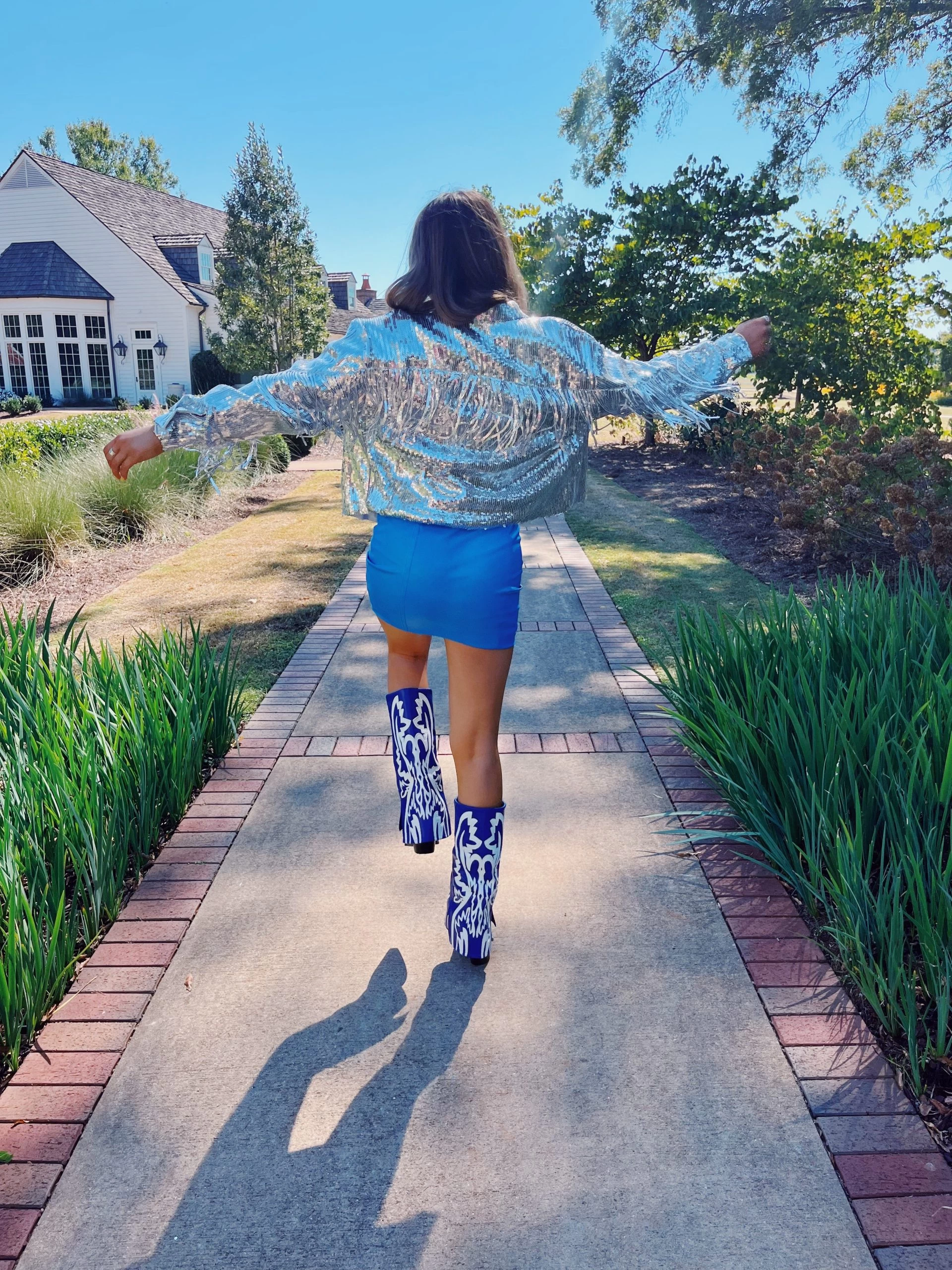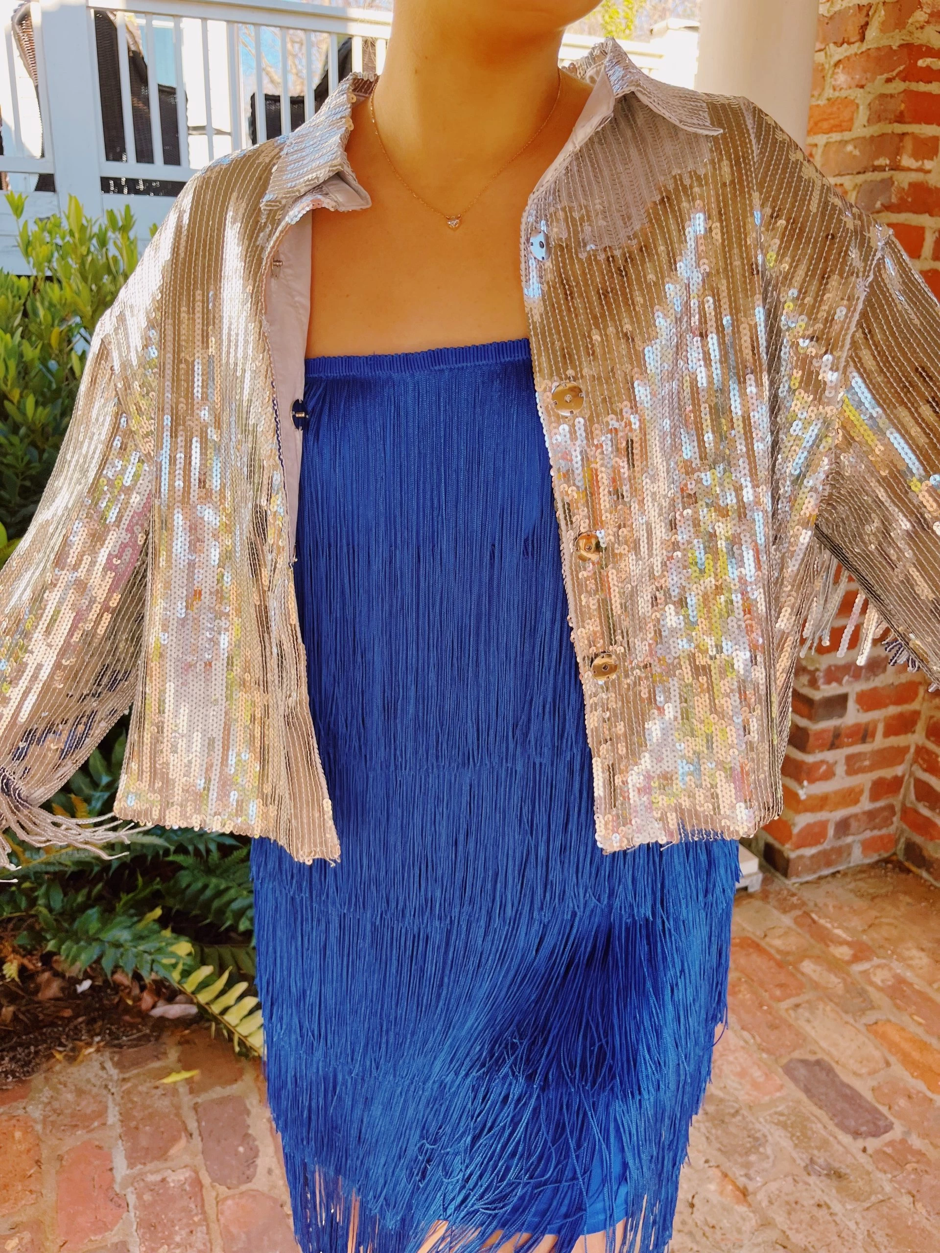 Sequin with sleeve and black fringe detail oversized cropped jacket.