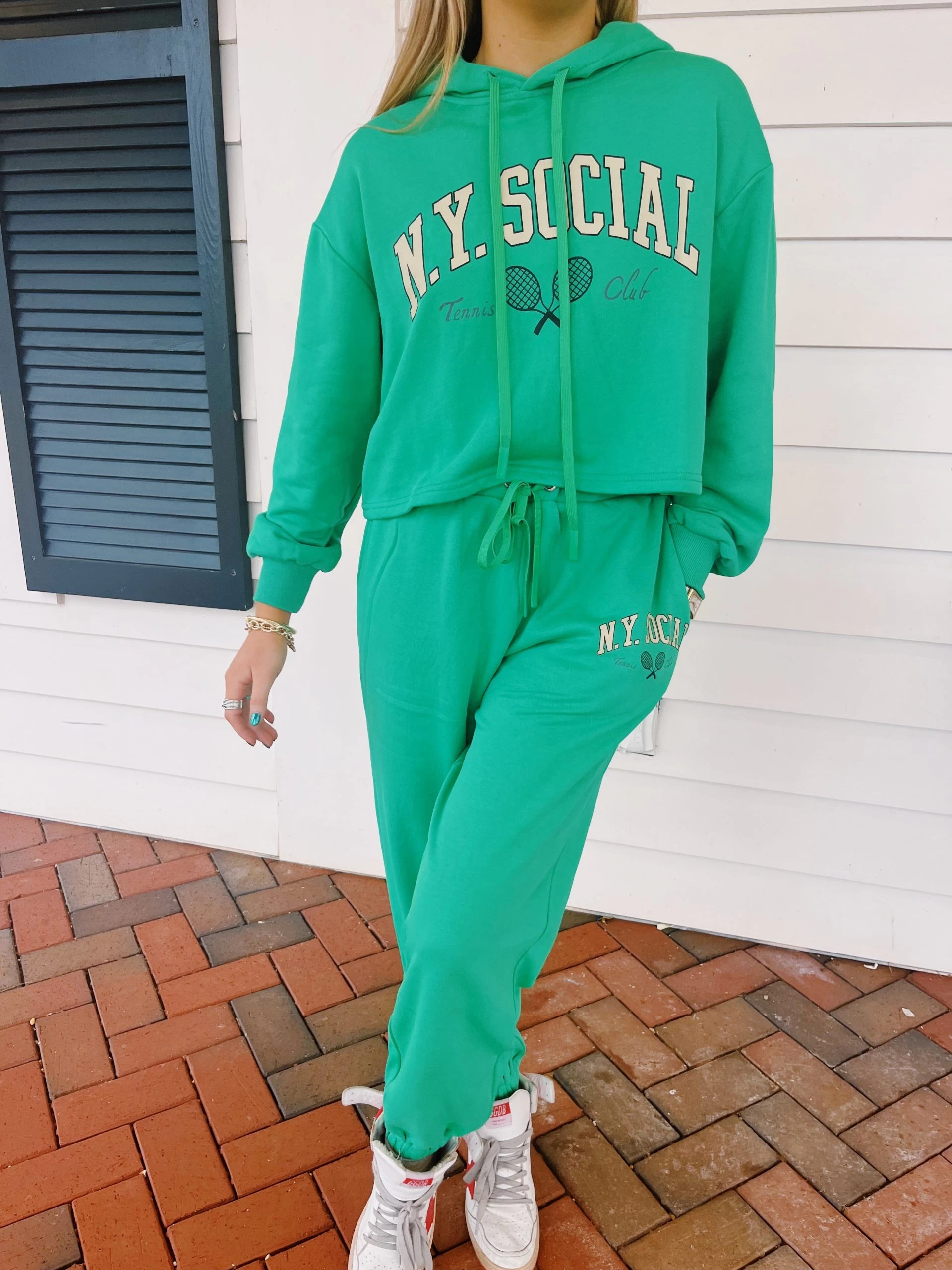 N.Y. Social Tennis Club sweat set! Joggers with a drawstring waist and a semi-cropped hoodie both with a cute design. Model is wearing a size small. SOLD AS A SET!