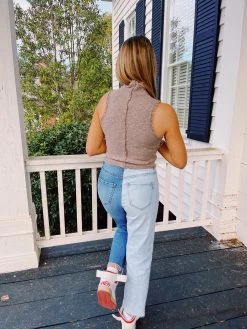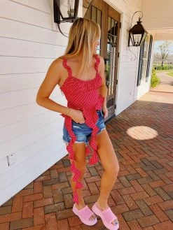 Retro print button up top with a contrast collar and button down trim! Model is wearing a size XS. Layers over our “Squared Retro Neck Dress – Pink/Orange” perfectly!