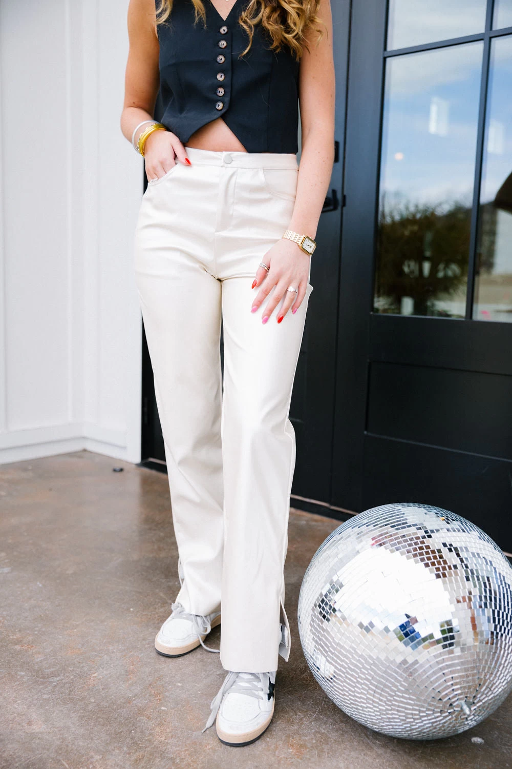 You will deserve a night out on the town in these straight leg faux leather pants! This style features straight legs with side slit at hem, zipper fly with button closure, and 4 pocket construction.