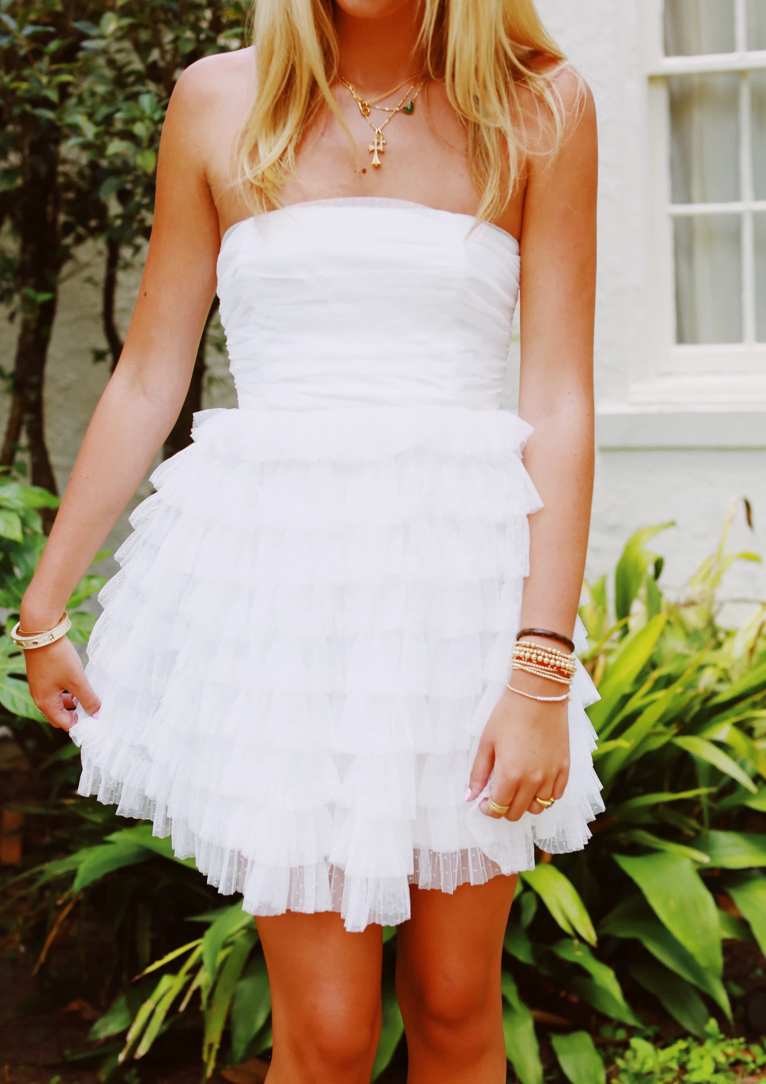 Monochromatic swiss mini dress. It features bust-ruched front darts, it’s strapless, and a fit flare silhouette. It also has a tiered ruffled tulle bottom and a smocked upper back.