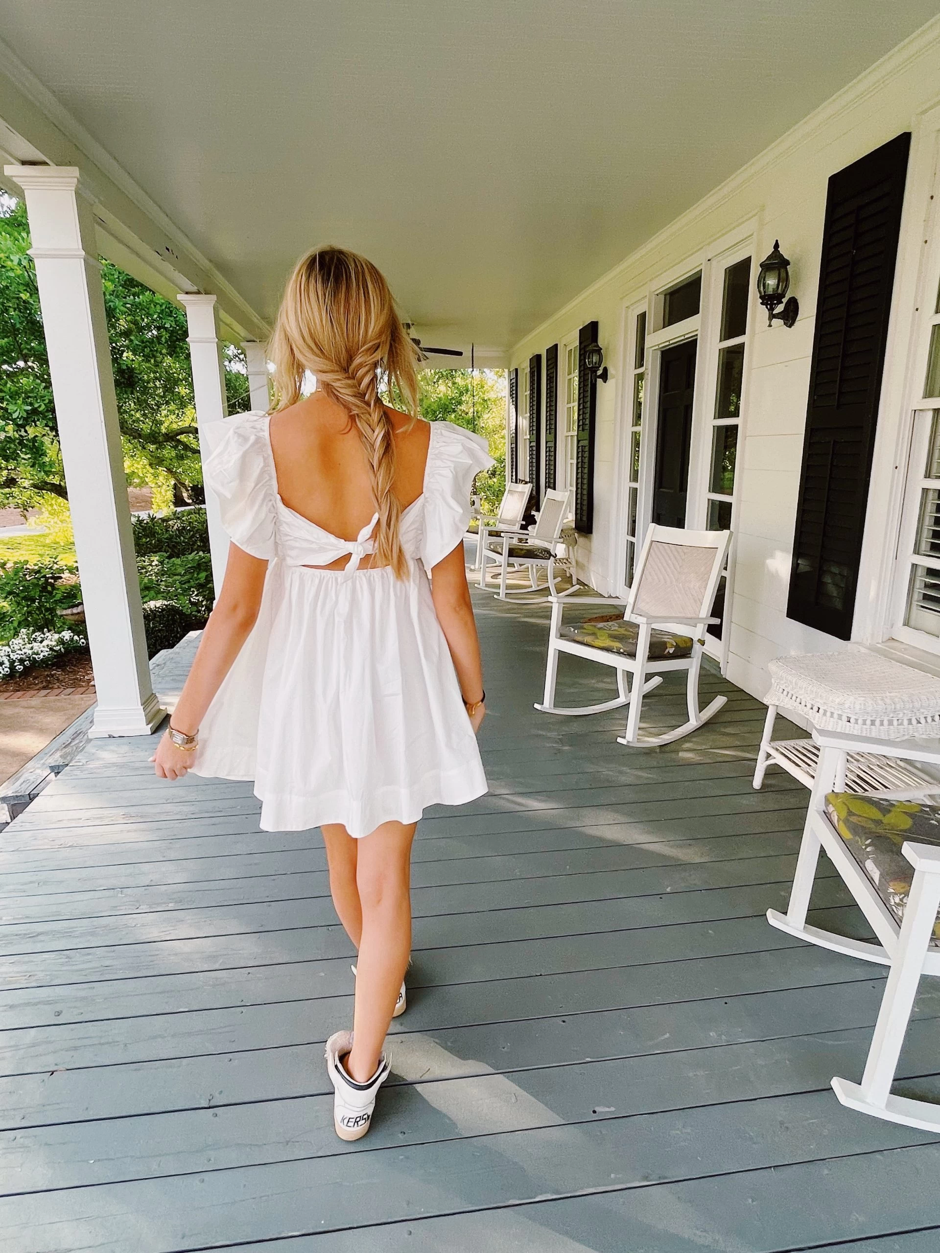 Ruffle detailed poplin dress! This fun and flirty dress is a great and easy fit. It has a bow tie in the back! It can be paired with boots or heels or even sneakers! Model is wearing a size small.