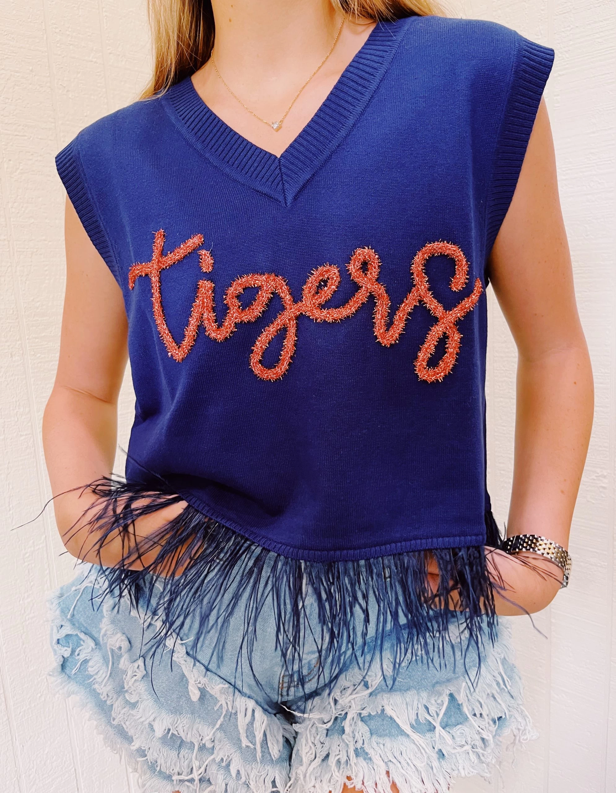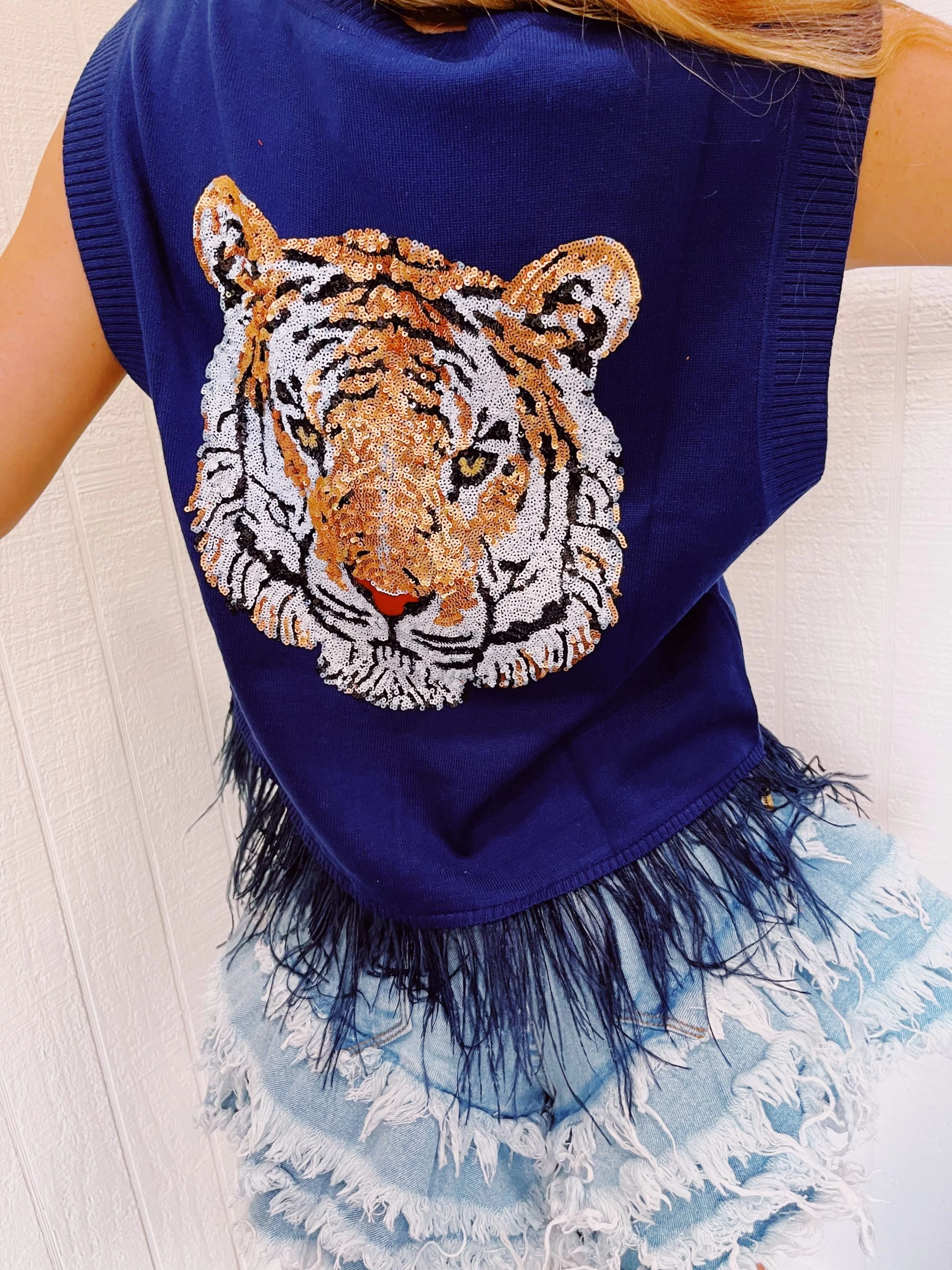 Sweater vest with feather fringe alone the bottom and a full sequin tiger on the back!