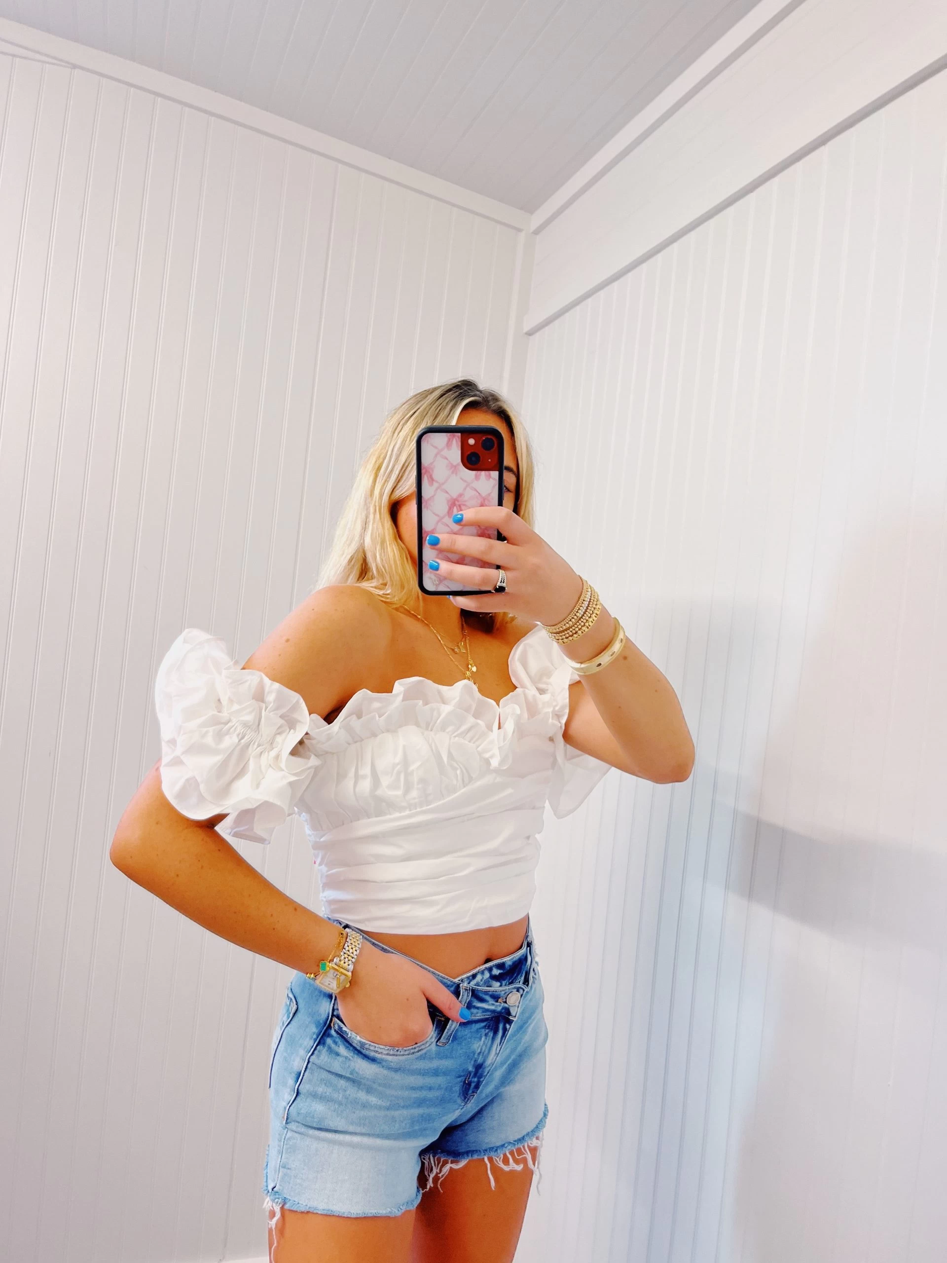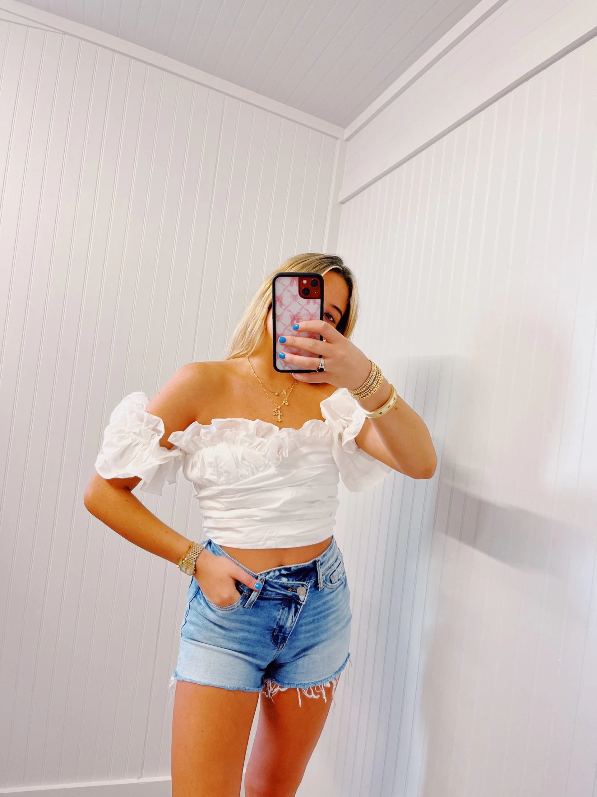 This cute off shoulder cropped top has short ruffled sleeves and ruffles around shoulders. It also has a padding on chest area! Model is wearing a size small. Silver zipper for easy on and off wear!