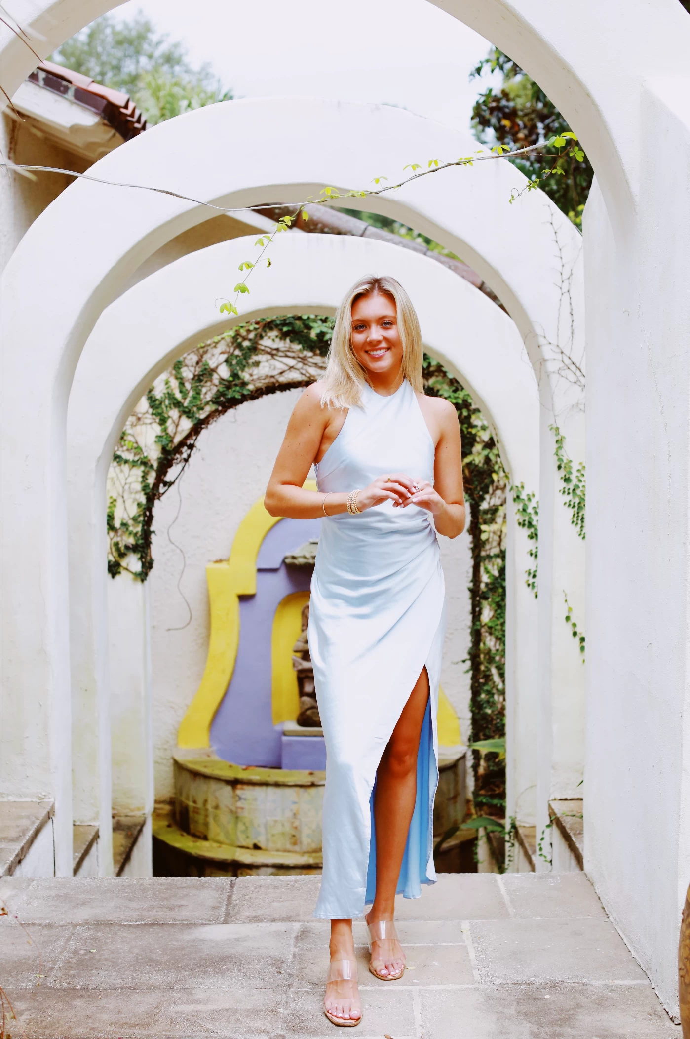 Oh now, you’ll be a standout in this steel blue To the Ball Dress! The satin halter neck design with a side slit will make you fall in love with this dress. Get ready to dance the night away in this piece.