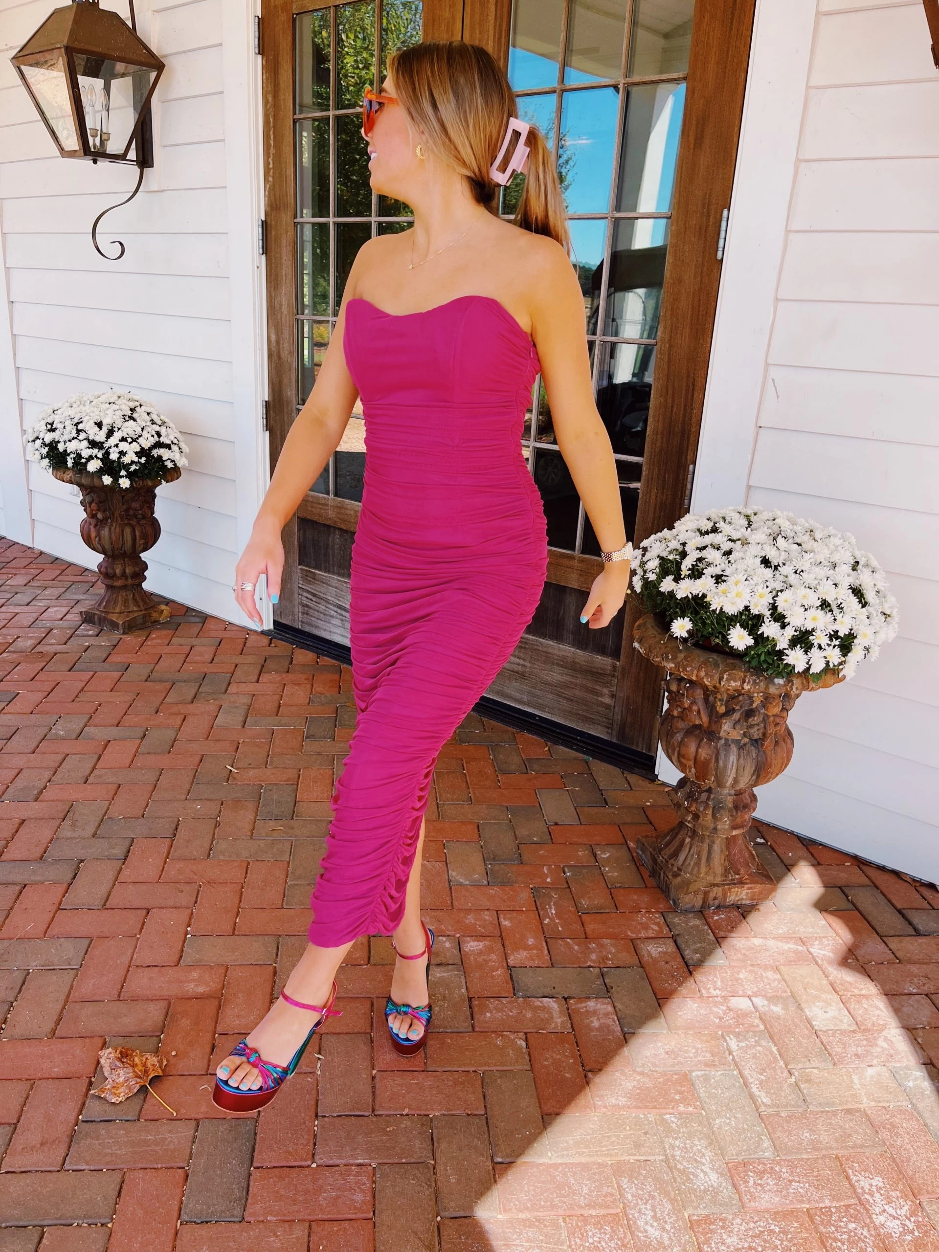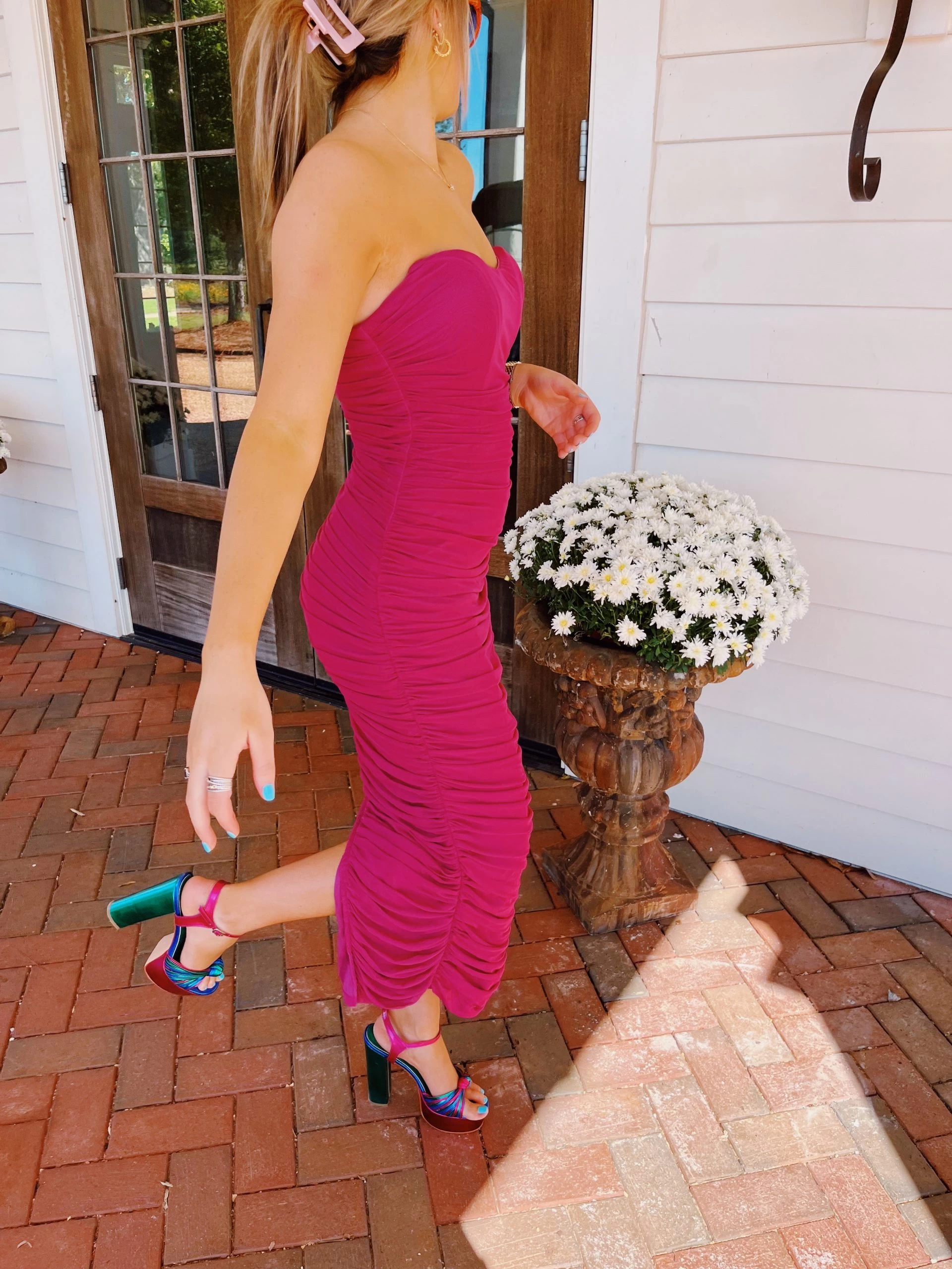 Ruched tube midi dress with built in padding and wire support! Model is wearing a size small.