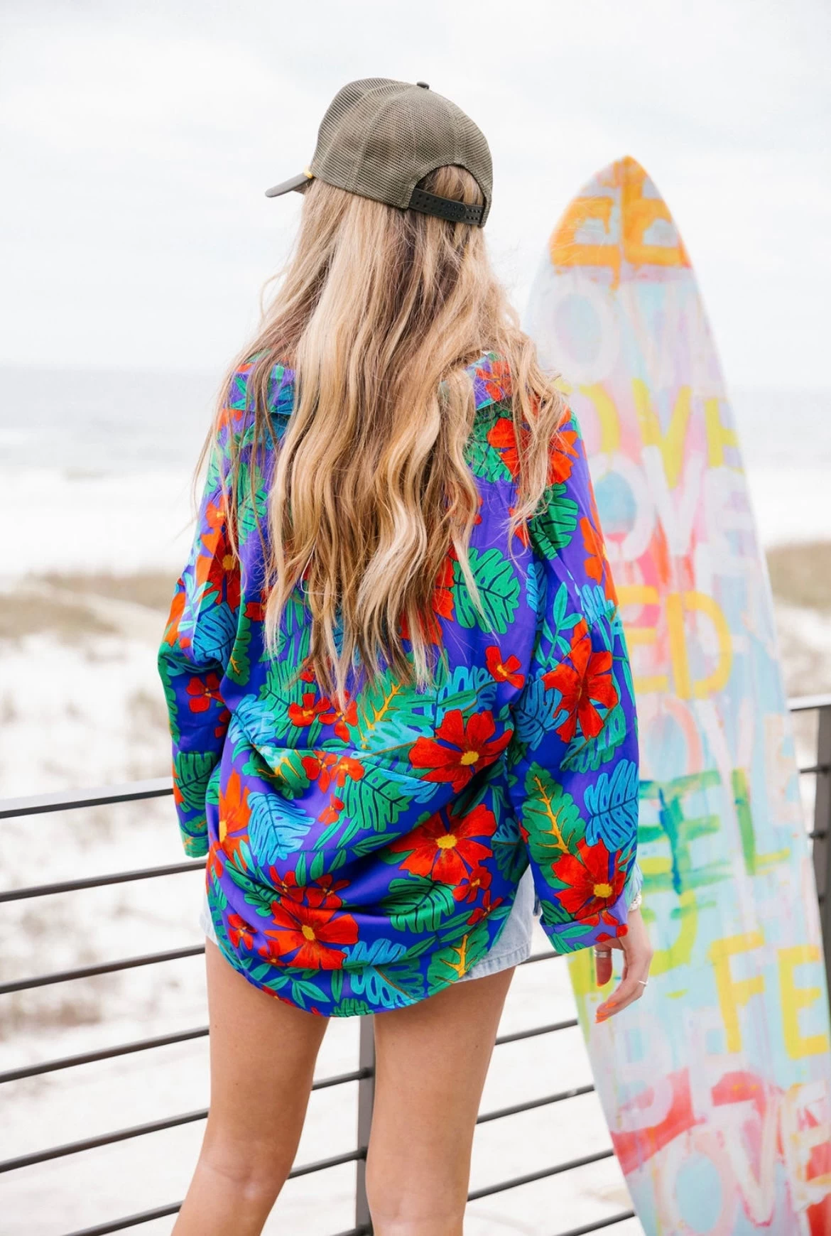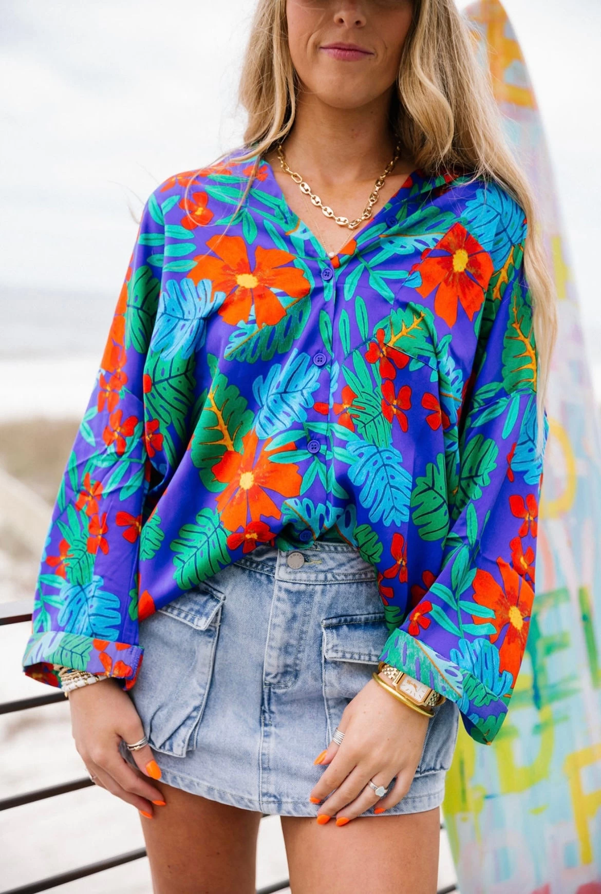 This relaxed fitting boyfriend shirt featuring three-quarter sleeves and drop shoulders is perfect paired with your favorite denim or throw it on as a cover up!